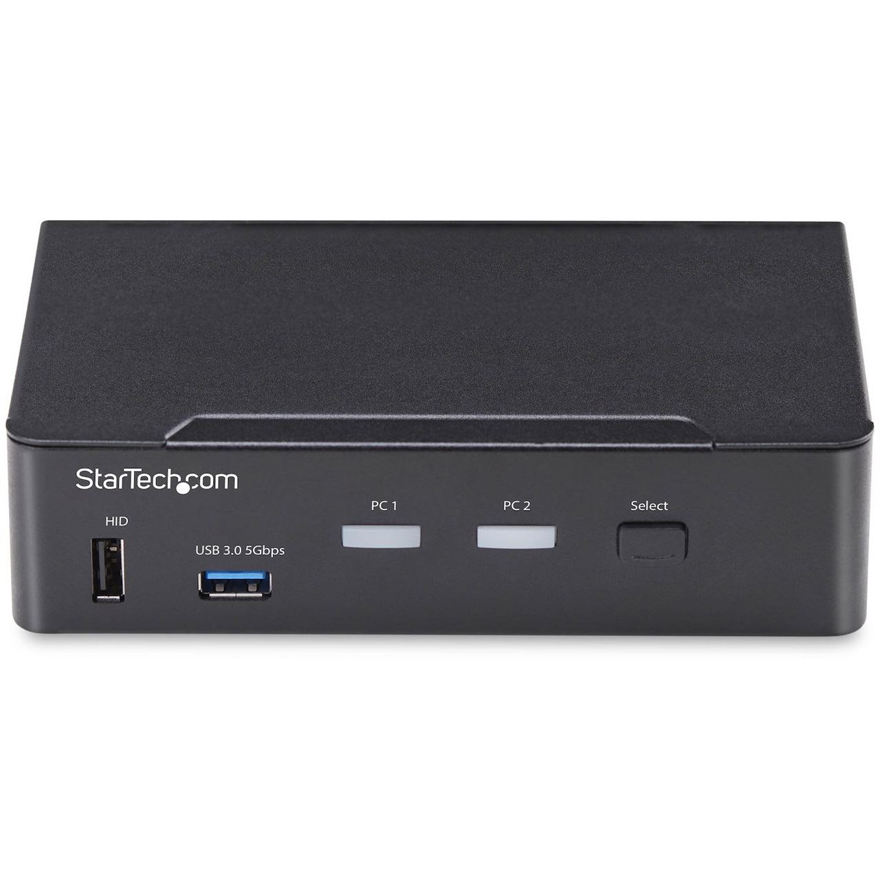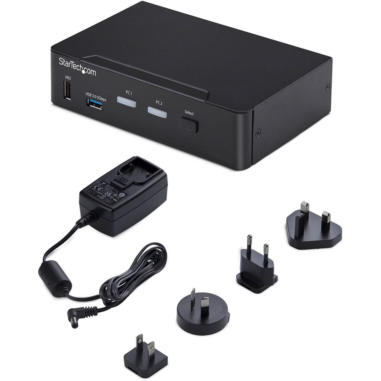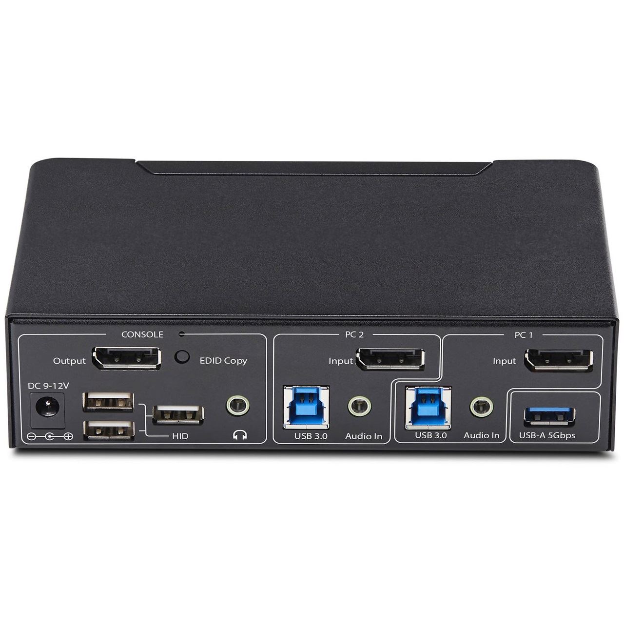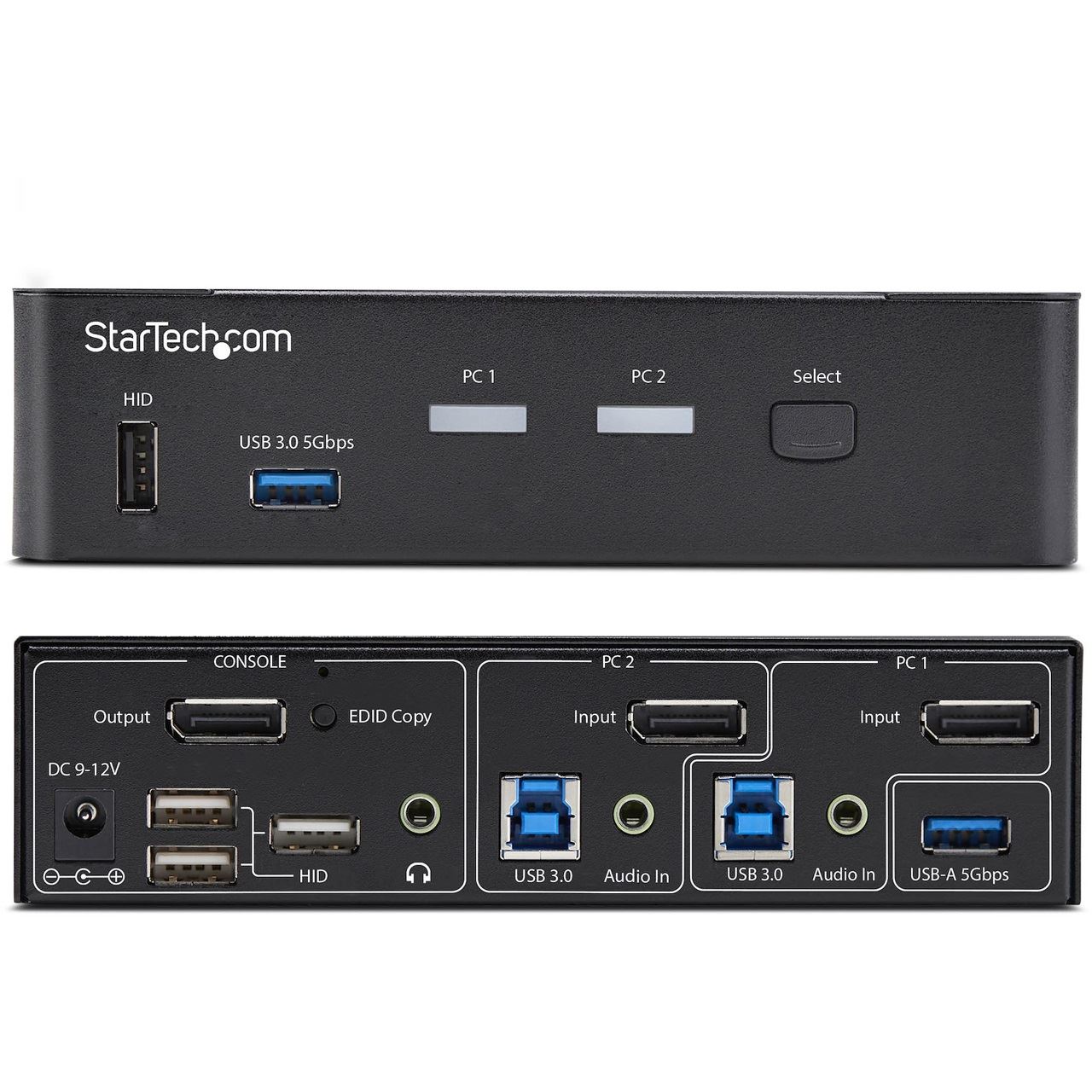 StarTech.com 2-Port DisplayPort KVM Switch, 4K 60Hz, DP 1.2, HDCP 1.4, EDID Management, 2-Port USB 3.0 Hub, 4x USB HID Ports, DP KVM Umschalter, TAA Konform. Tastatur Porttyp: USB, Maus-Porttyp: USB, Video Porttyp: DisplayPort. HD-Typ: 4K Ultra HD, Maximale Auflösung: 3840 x 2160 Pixel, Datenübertragungsrate (max): 5 Gbit/s. Produktfarbe: Schwarz, Gehäusematerial: Stahl, Maximum Kabellänge: 3 m. Energiequelle: Gleichstrom, Eingangsspannung: 100 - 240 V, Eingangsstrom: 1 A. Konformitätsbescheinigungen: Eidgenössische Kommunikationskommission (FCC), RoHS, Gesetz über Handelsabkommen (TAA)