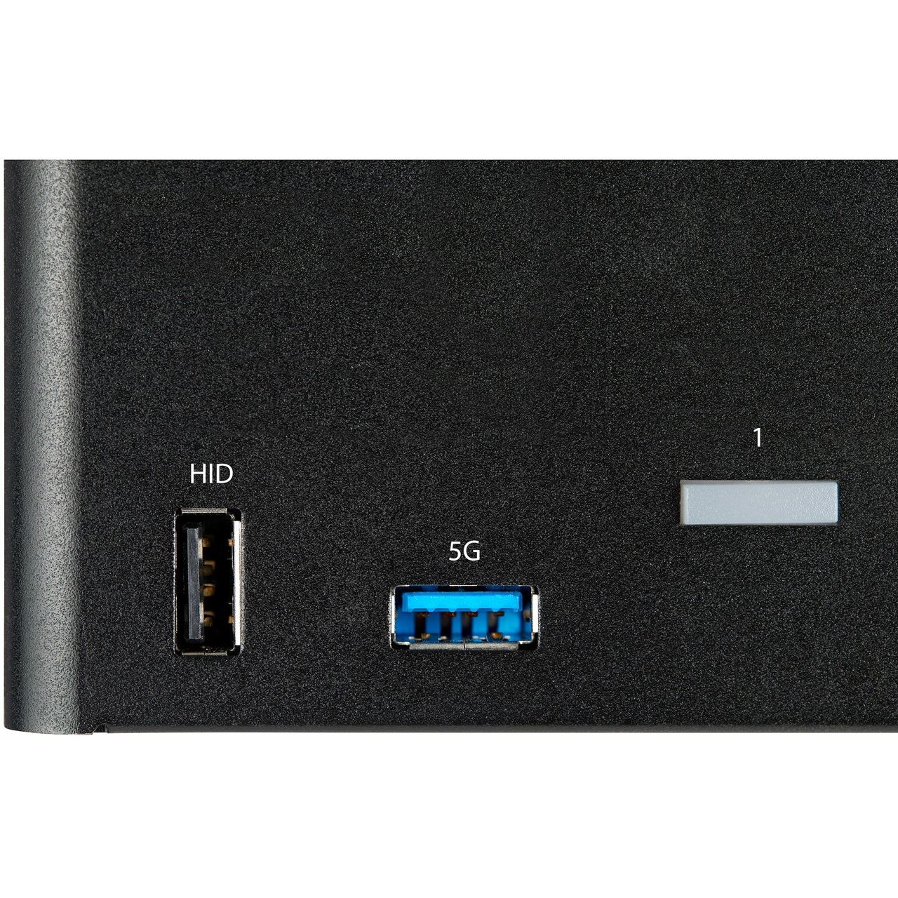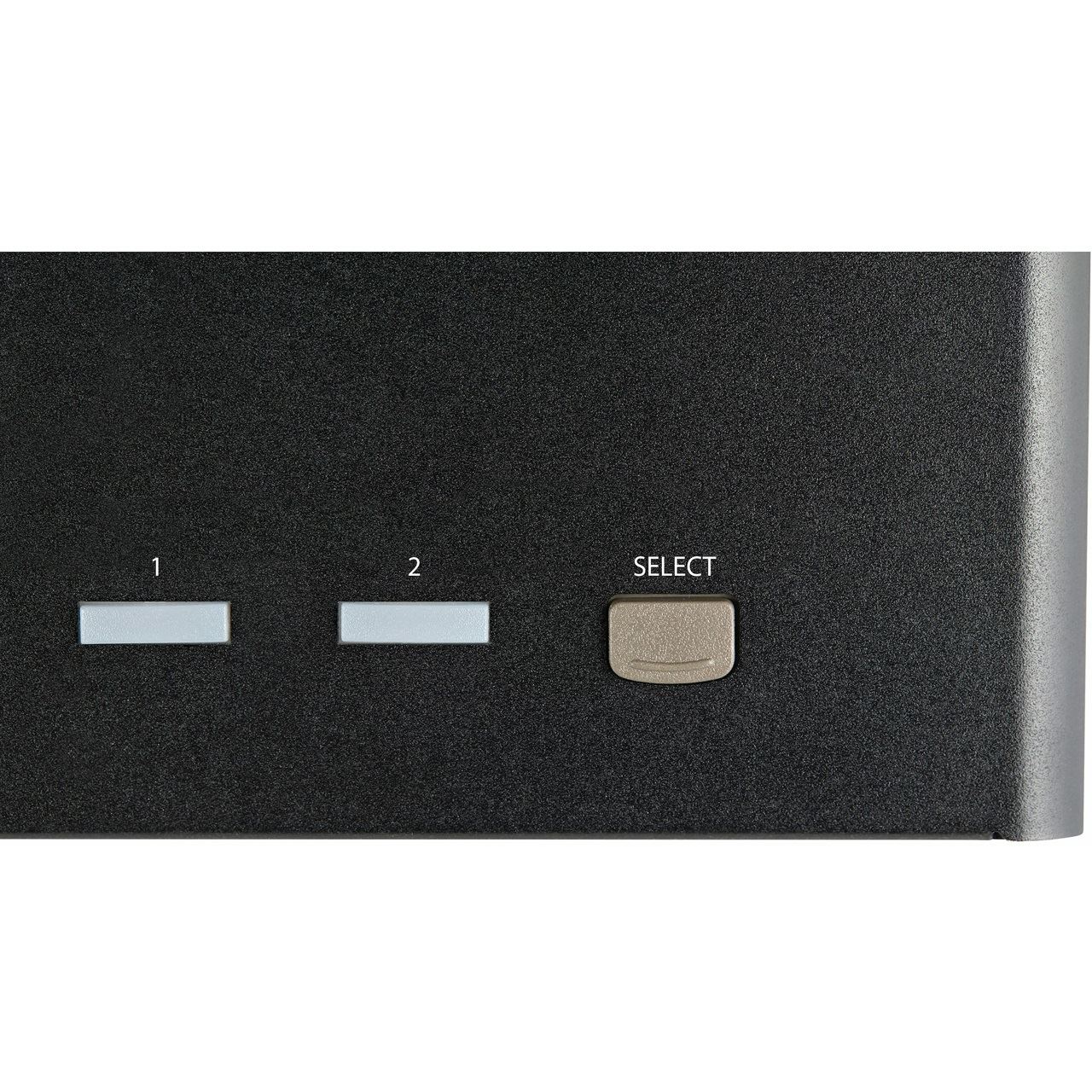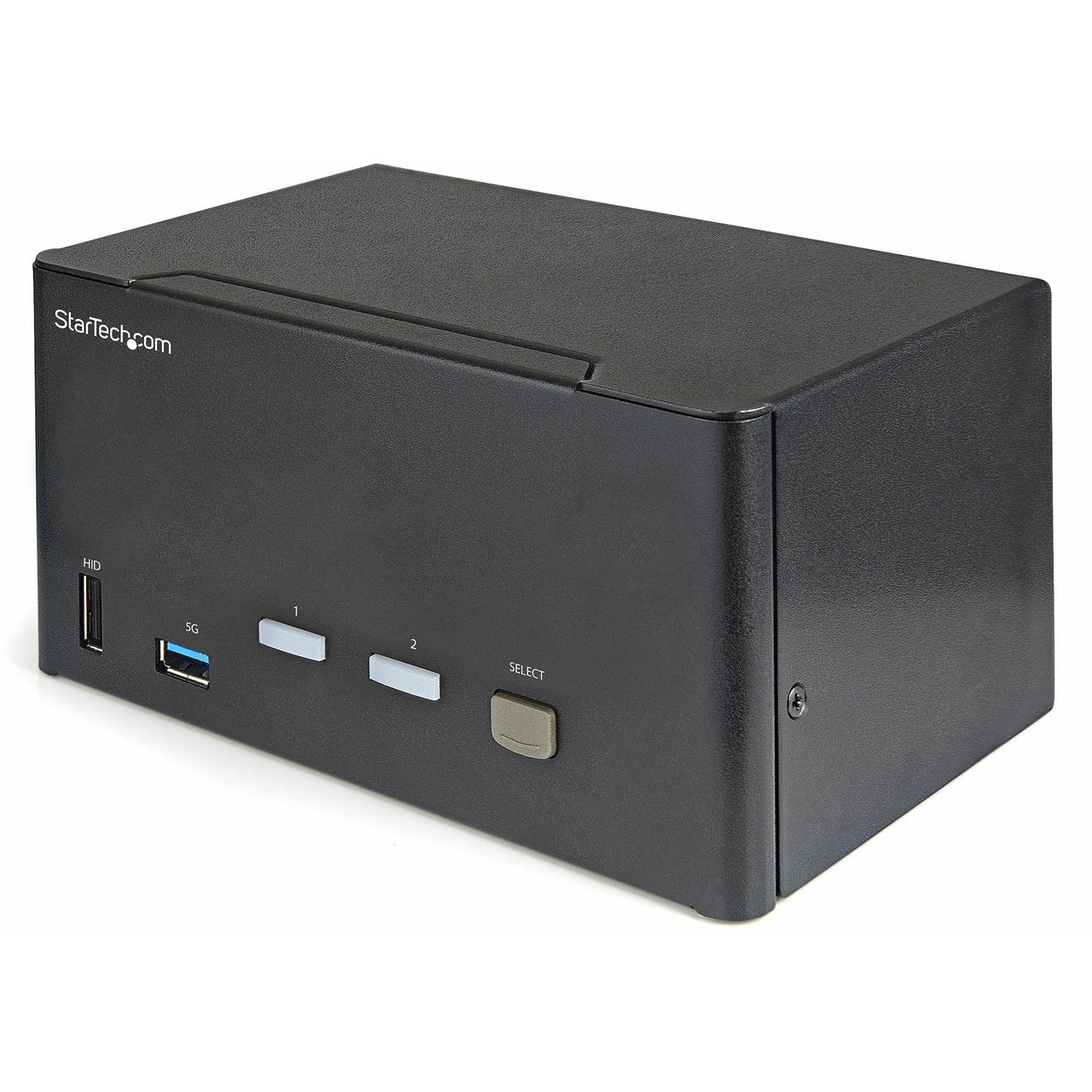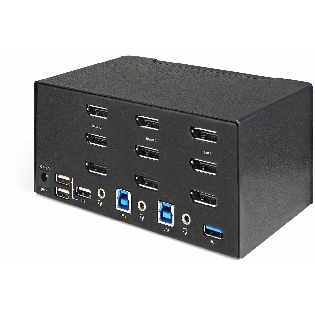 StarTech.com 2 Port DisplayPort KVM Switch - 4K 60 Hz UHD HDR - DP 1.2 KVM Umschalter mit USB 3.0 Hub mit 2 Anschlüssen (5 Gbit/s) und 4x USB 2.0 HID Anschlüssen, Audio - Hotkey - TAA. Tastatur Porttyp: USB, Maus-Porttyp: USB, Video Porttyp: DisplayPort. HD-Typ: 4K Ultra HD, Maximale Auflösung: 3840 x 2160 Pixel, Videobandbreite: 60 Hz. Produktfarbe: Schwarz, Gehäusematerial: Stahl, Mittlere Betriebsdauer zwischen Ausfällen (MTBF): 156000 h. Eingangsspannung: 100 - 240 V, Eingangsstrom: 1 A, Ausgangsspannung: 12 V. Breite: 160 mm, Tiefe: 100 mm, Höhe: 98 mm