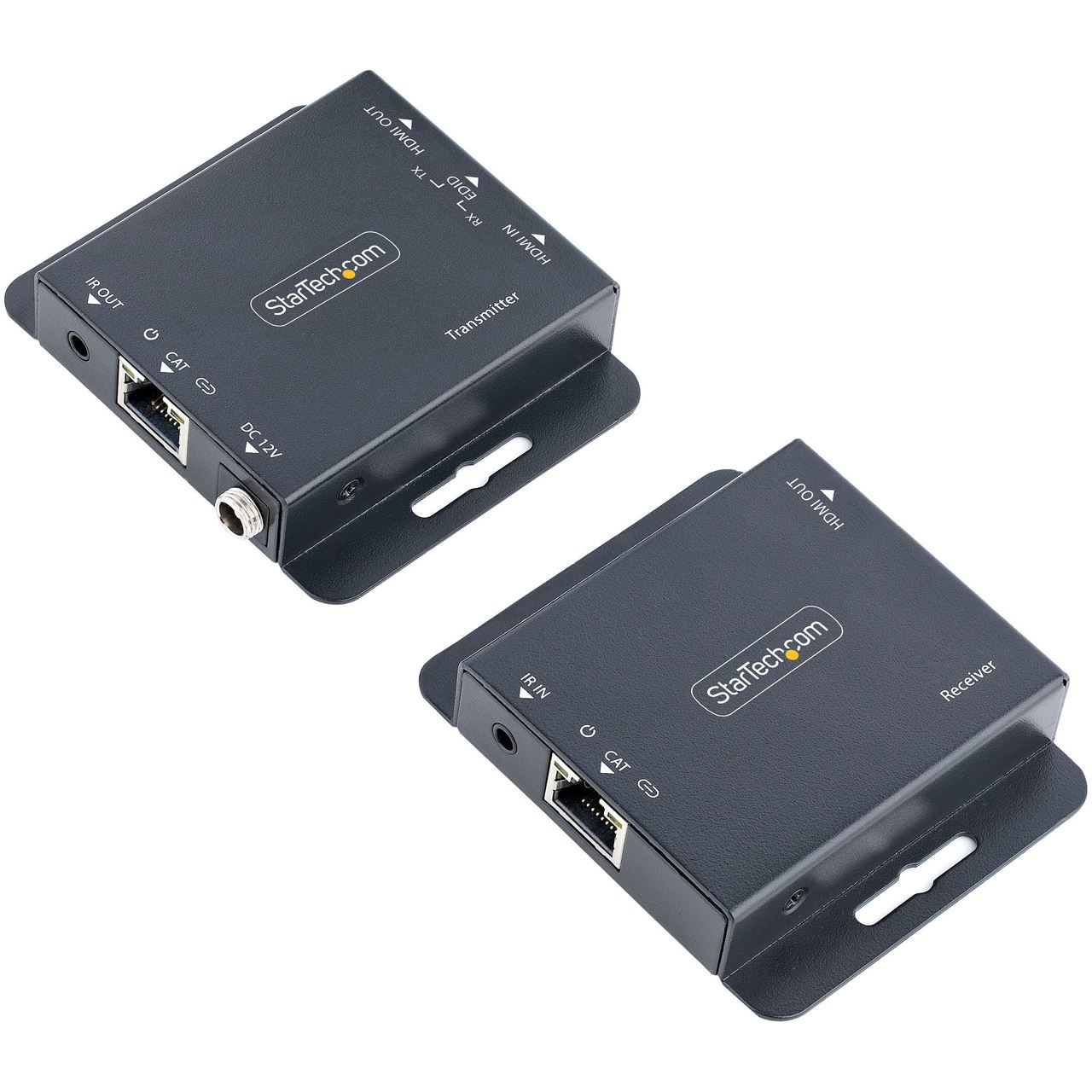 StarTech.com HDMI Ethernet Extender über CAT6/CAT5, 4K 30Hz/40 m oder 1080p/70 m, HDMI over Ethernet/IP Extender, HDMI Lan Transmitter und Receiver Kit, HDMI Verlängerung, IR. Typ: AV-Sender & -Empfänger, Maximale Auflösung: 3840 x 2160 Pixel, unterstütze Kabeltypen: Cat5e, Cat6. Übertragungstechnik: Kabelgebunden. AC Eingangsspannung: 100 - 240 V, Arbeitsspannung: 12 V, Eingangsstrom: 0.3 A. Breite: 69 mm, Tiefe: 57 mm, Höhe: 17 mm. Verpackungsbreite: 200 mm, Verpackungstiefe: 116 mm, Verpackungshöhe: 77 mm