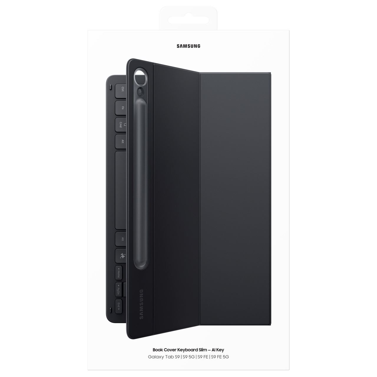 Samsung Book Cover Keyboard Slim EF-DX720 für das Galaxy Tab S9 | S9 FE. Tastaturaufbau: QWERTZ, Tastatursprache: Deutsch, Eingabegerät: Touchpad. Markenkompatibilität: Samsung, Kompatibilität: Galaxy Tab S9, Galaxy Tab S9 FE, Produktfarbe: Schwarz. Übertragungstechnik: Andocken, Geräteschnittstelle: Pogo Pin. Energiequelle: Dock. Breite: 255,5 mm, Tiefe: 14 mm, Höhe: 168,9 mm