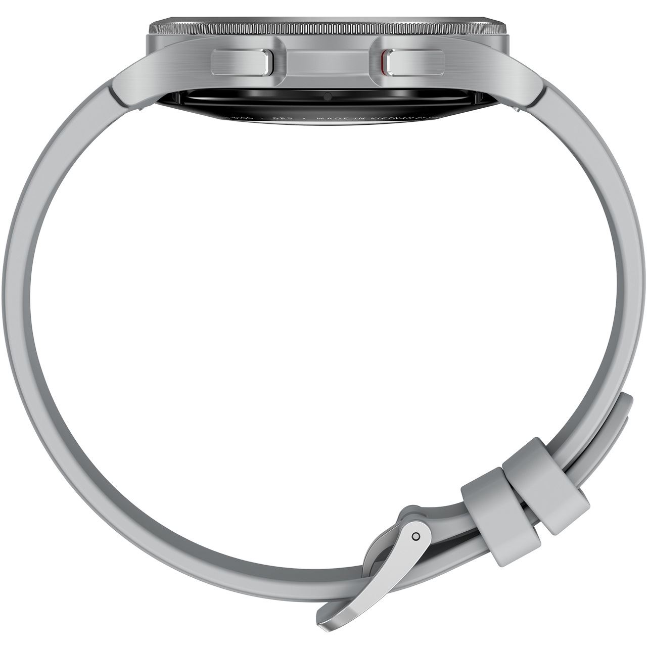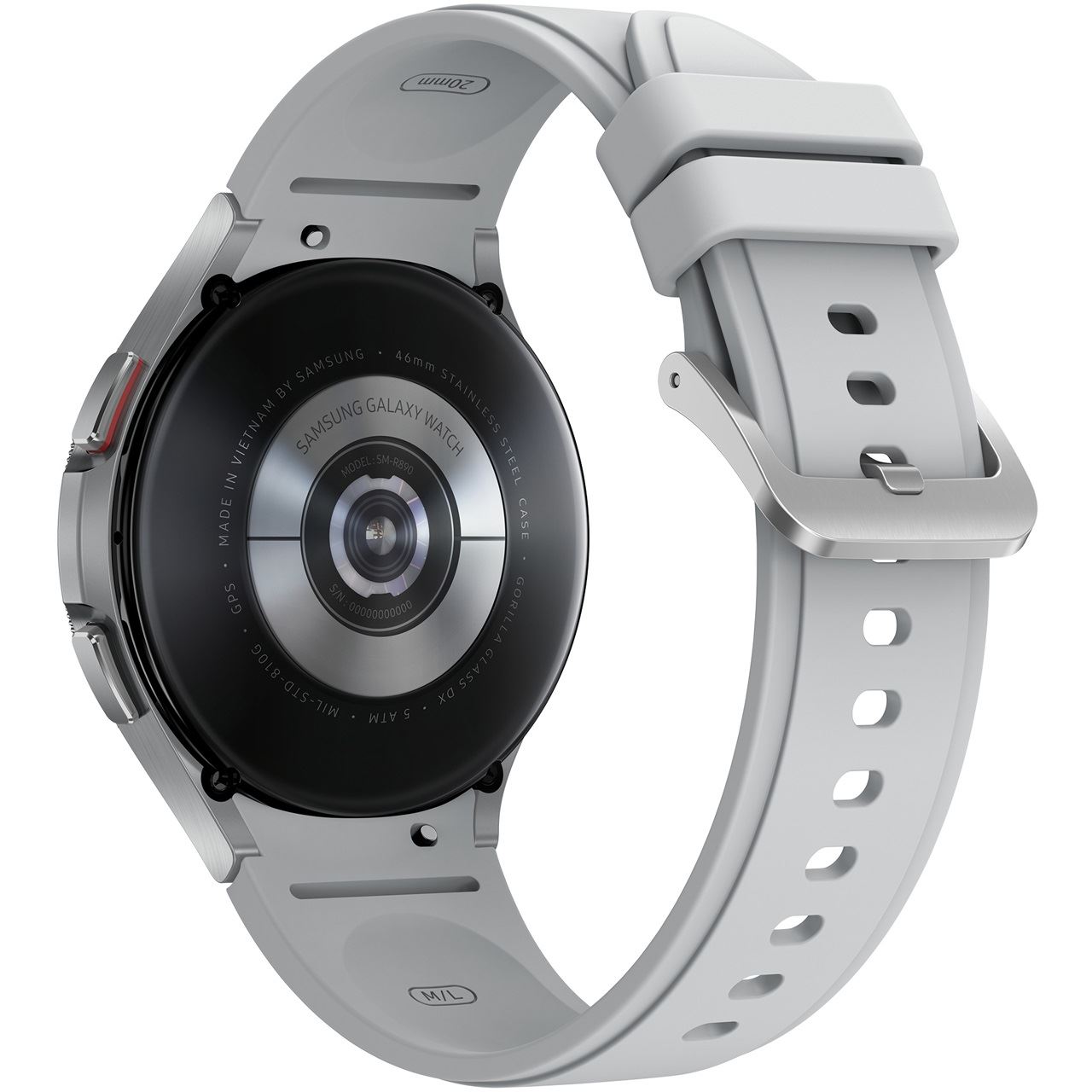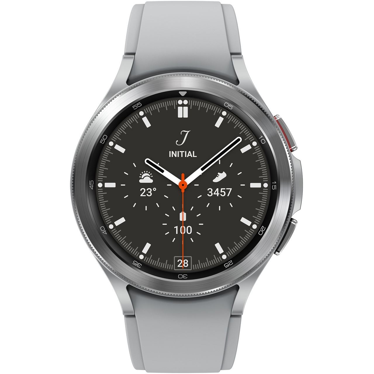 Samsung Galaxy Watch4 Classic . Bildschirmdiagonale: 3,56 cm (1.4"), Bildschirmtechnologie: OLED, Display-Auflösung: 450 x 450 Pixel, Touchscreen. Prozessortaktfrequenz: 1180 MHz. RAM-Kapazität: 1500 MB, Flash-Speicher: 16 GB. WLAN. GPS. Akku-/Batteriekapazität: 361 mAh. Gewicht: 52 g. Wasserdicht bis: 50 m, Bandmaterial: Fluor-Elastomer, Armbandfarbe: Grau. Installiertes Betriebssystem: Wear OS