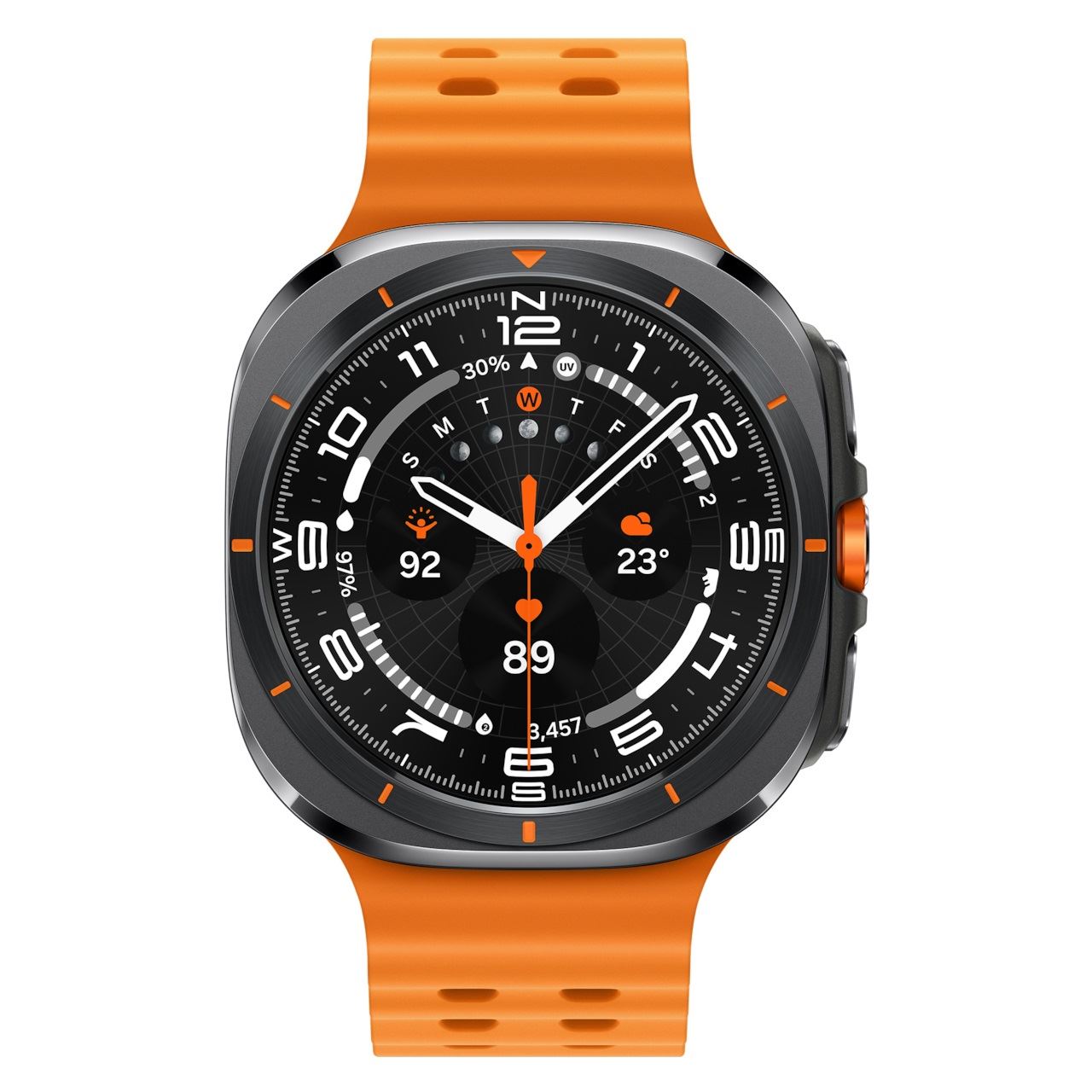 Die Galaxy Watch Ultra geht mit dir an deine Grenzen – und darüber hinaus. Sie widersteht Hitze bis zu 55 °C, 9.000 m Höhe und 10 ATM Wasserdruck und läuft dank eines neuen, leistungsstarken 3 nm-Prozessors reibungslos. Mit dem Akku, der im Energiesparmodus bis zu 100 Stunden hält, kommst du richtig weit. Dank des neuen BioActive-Sensors hast du all deine Gesundheitsdaten ganz genau im Blick, und die Galaxy AI liefert die Erkenntnisse, die du brauchst, um über dich hinauszuwachsen.