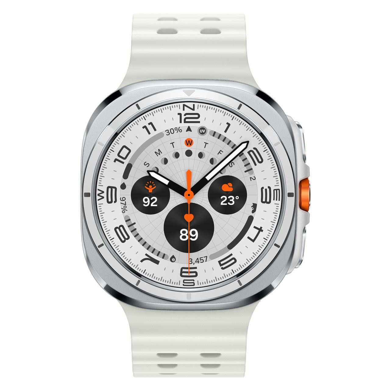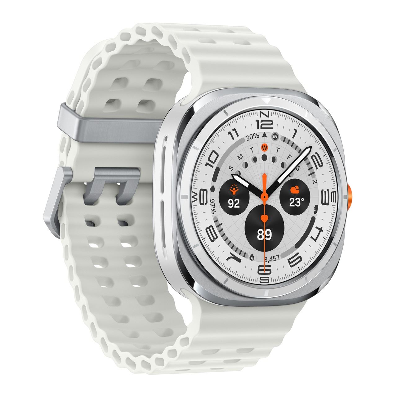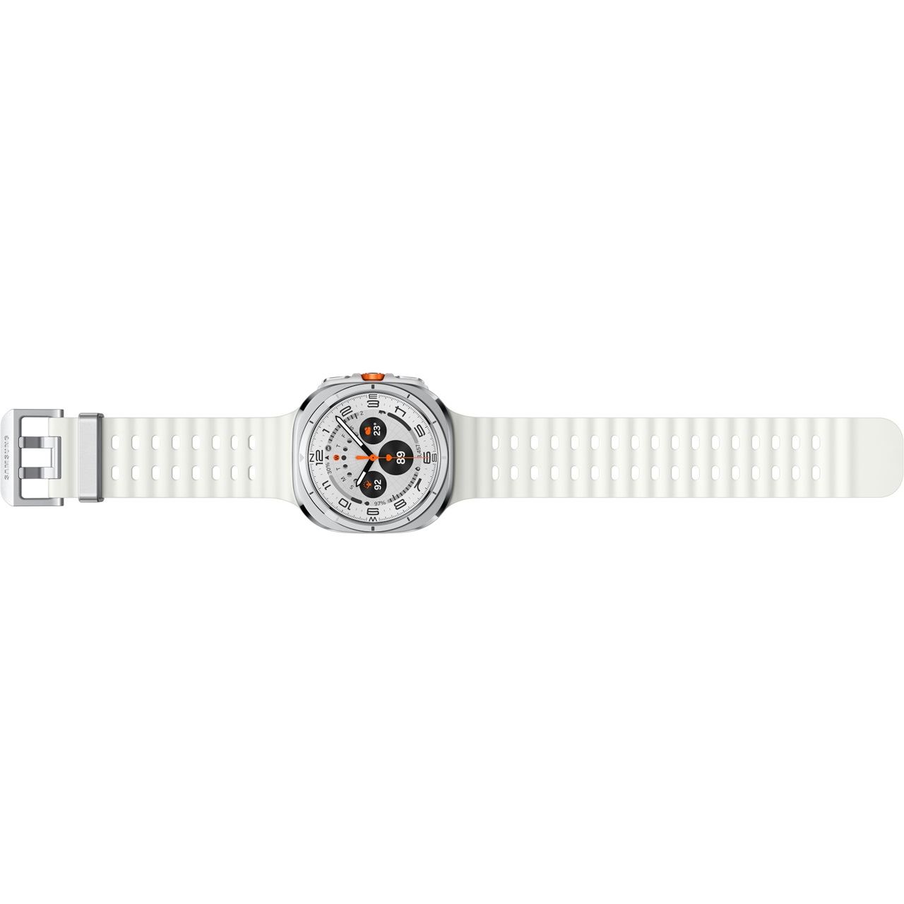 Samsung Galaxy Watch Ultra . Bildschirmdiagonale: 3,81 cm (1.5"), Bildschirmtechnologie: AMOLED, Display-Auflösung: 480 x 480 Pixel, Touchscreen. RAM-Kapazität: 2000 MB, Flash-Speicher: 32 GB. WLAN. GPS. Akku-/Batteriekapazität: 590 mAh. Gewicht: 60,5 g. Armbandfarbe: Weiß, Bandgröße: Universalgröße. Installiertes Betriebssystem: Wear OS