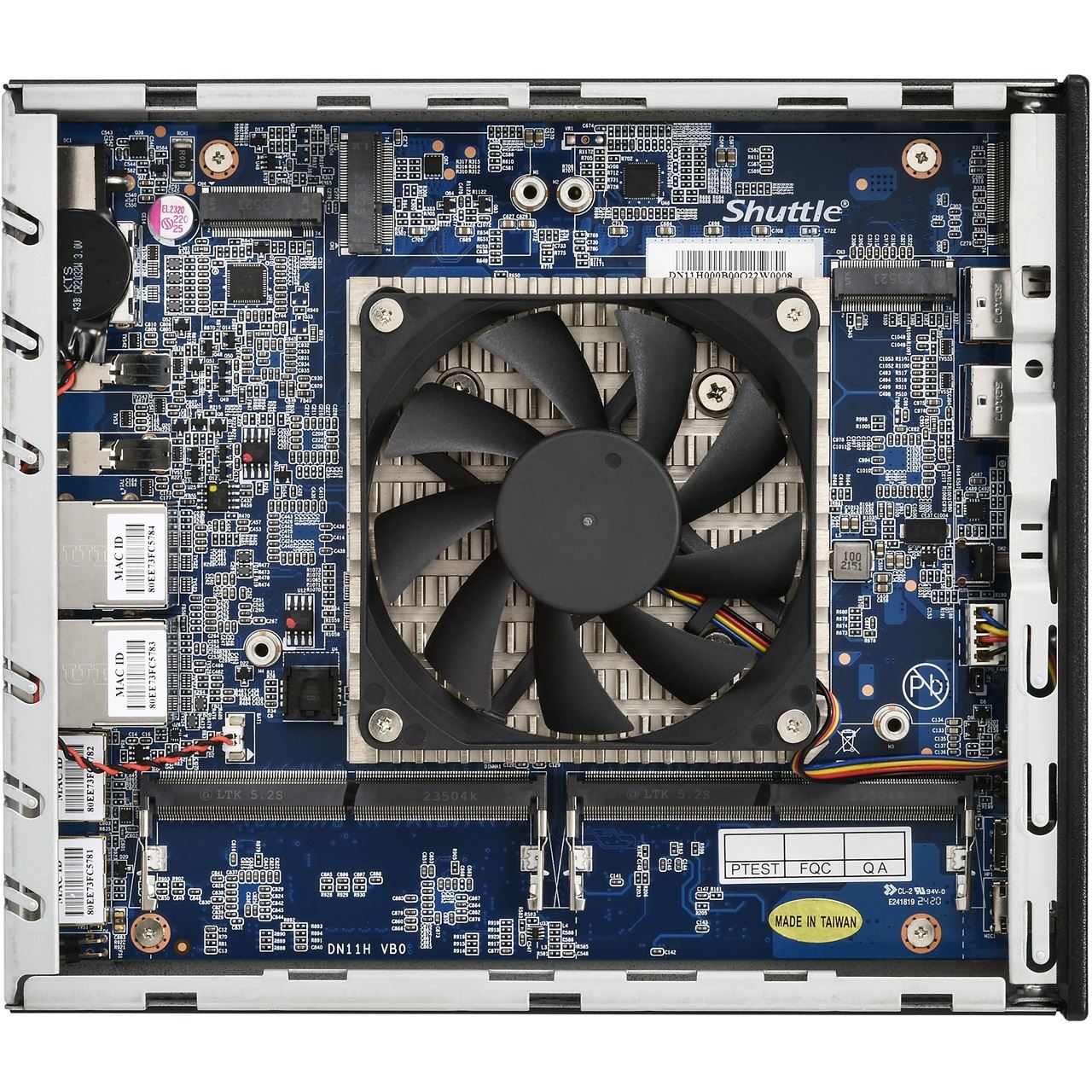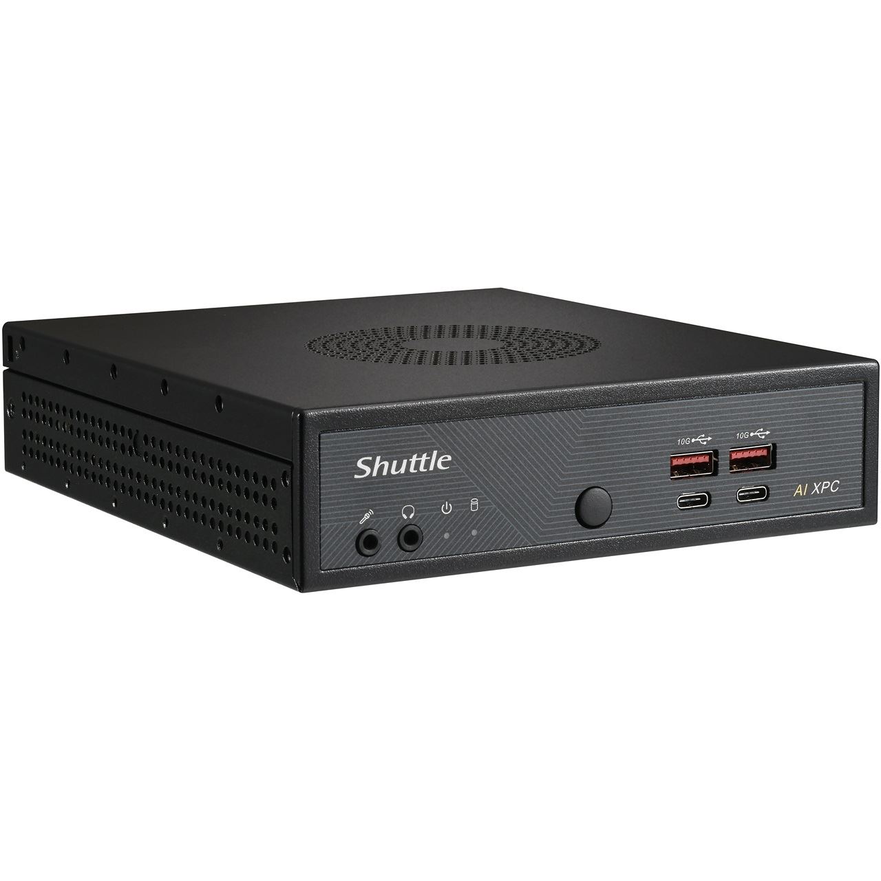 Shuttle Slim AI PC DN11H9 Intel Core Ultra 9 185H, Intel Arc graphics, 2xHDMI, 2x DP, 4x 2.5Gbit LAN, VESA, 24/7 Dauerbetrieb. Gehäusetyp: 1,35 l großer PC, Produkttyp: Mini-PC Barebone. Motherboard Chipsatz: Intel SoC, BIOS-Typ: UEFI AMI. Unterstützte Arbeitsspeicher: DDR5-SDRAM, Anzahl der Speichersteckplätze: 2, RAM-Speicher maximal: 96 GB. Unterstützte Speicherlaufwerke: SSD, Speicherlaufwerk Schnittstelle: PCI Express. Anzahl Ethernet-LAN-Anschlüsse (RJ-45): 4. Kühlung: Aktiv. Stromversorgung: 120 W