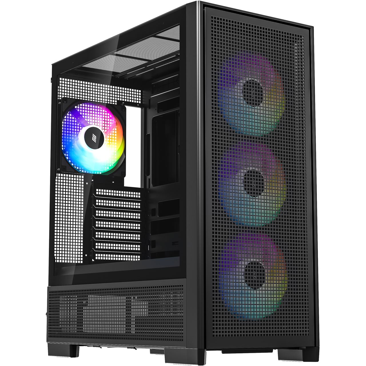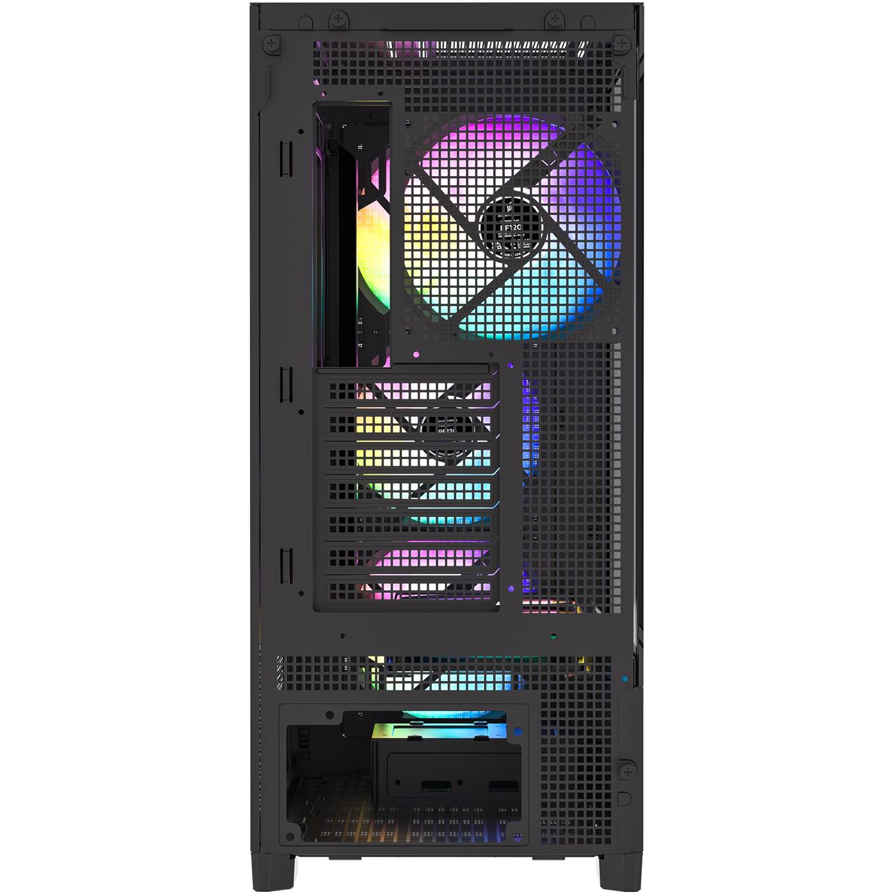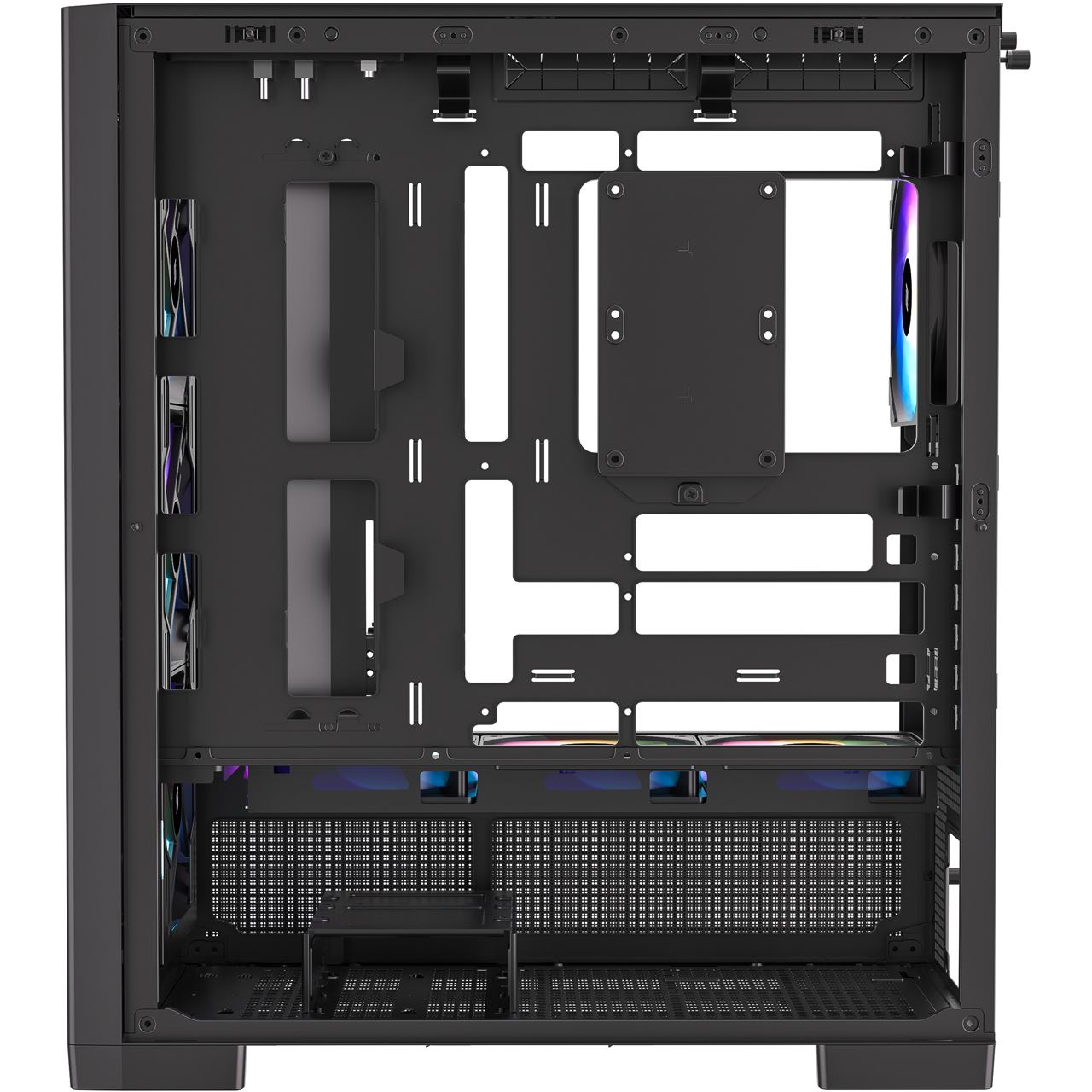 Im großzügig gestalteten Innenraum finden auch lange Grafikkarten, hohe CPU-Kühler und umfangreiche Kühlkonzepte problemlos Platz. Mehrere Montageoptionen ermöglichen den Einsatz großer Radiatoren und bieten damit maximale Flexibilität für individuelle Builds. Das Seitenteil aus gehärtetem Glas erlaubt einen freien Blick auf die verbaute Hardware und setzt diese zusammen mit der adressierbaren RGB-Beleuchtung stilvoll in Szene.