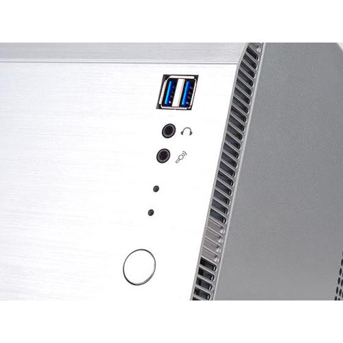 Die Front ist von einem auffälligen Knick geprägt, wobei der obere Teil nach hinten versetzt wurde und die Blende für ein 5,25 Zoll Slim Laufwerk beherbergt. Als Material wurde eine gebürstete Aluminiumplatte verwendet, wobei die edle Optik des Metalls wesentlich für den hochwertigen Gesamteindruck verantwortlich ist. Im unteren Teil wurden die Bedienelemente und das I/O-Panel sauber in einer vertikalen Linie an der rechten Seite angeordnet.