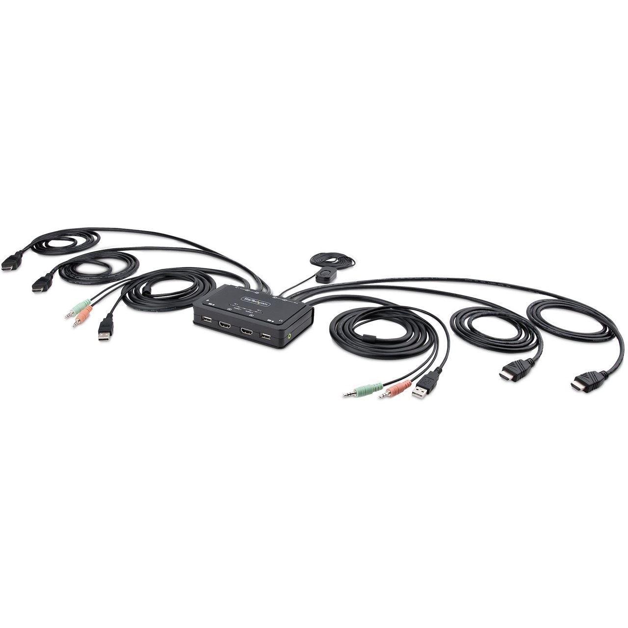 Der KVM-Switch ist mit einer Bus-Stromversorgung ausgestattet und verfügt über integrierte Dual-HDMI-, USB-A- und 3,5mm Audio Eingangs-/Ausgangskabel. Dies gewährleistet Kompatibilität und Leistung zwischen KVM-Switch, Monitoren und Peripheriegeräten - ohne dass die für diese Verbindungen erforderlichen Kabel ausgewählt und gekauft werden müssen.