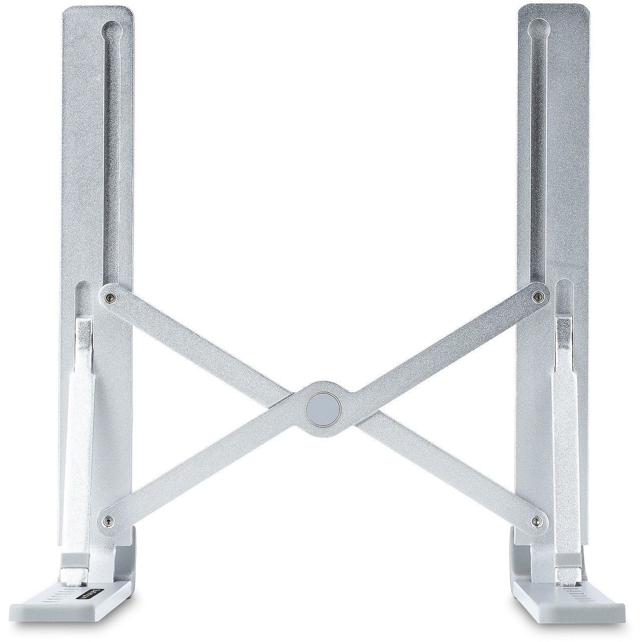 Der elegante Laptopständer ist aus Aluminium gefertigt, um Strapazierfähigkeit und Robustheit zu gewährleisten, und die silberne Eloxierung ergänzt das Design. Die Auflagefläche erleichtert die passive Kühlung, indem sie den ungehinderten Luftstrom um die Basis des montierten Geräts unterstützt. Die rutschfesten Gummifüße schützen die Arbeitsfläche vor Kratzern und Abrieb, auch bei Schreibtischen mit Glasplatte.