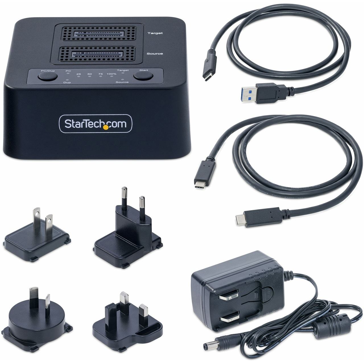 StarTech.com 1:1 M.2 NVMe Kopierstation, 90GB/m Unabhängiger PCIe SSD Duplicator/Clone Station, USB-C 3.2 20Gbps M.2 Dual-Bay Dock, NVMe Cloner, USB-C/A Kabeln. Produkttyp: HDD/SSD-Duplikator, Anzahl der simultanen Kopien: 1 Kopien, Schnittstelle: USB 3.2 Gen 2 (3.1 Gen 2). SSD Schnittstelle: M.2. Stromverbrauch (Standardbetrieb): 0,1 W, AC Eingangsspannung: 100 - 240 V, Eingangsstrom: 0.6 A. Abmessungen (BxTxH): 77 x 77 x 44 mm, Gewicht: 129 g. Verpackungsbreite: 160 mm, Verpackungstiefe: 90 mm, Verpackungshöhe: 95 mm