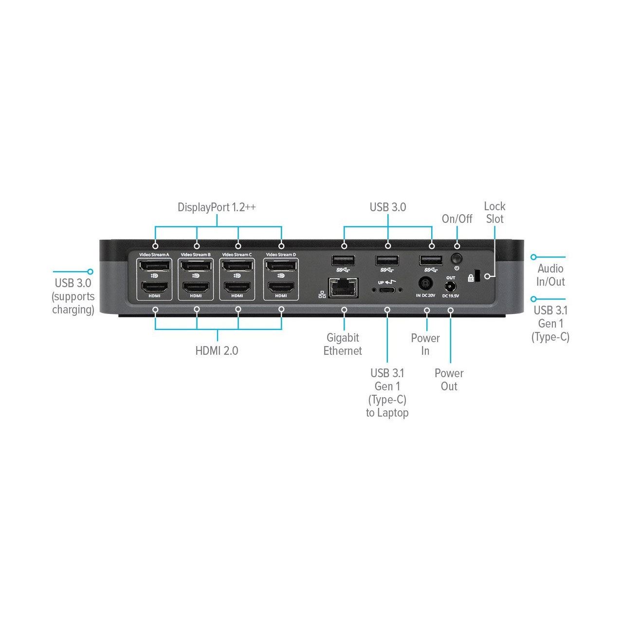Steigern Sie Ihre Produktivität und Performance mit der ersten universellen Enterprise Class-Dockingstation für vier erweiterte 4K-Monitore. Ideal für große Unternehmen – die Targus USB-C™ Universal Quad 4K (QV4K) Dockingstation optimiert die Bildschirmnutzung. Dual DisplayLink® DL-6910 Chip-Technologie unterstützt bis zu vier DisplayPort (3840 x 2160 p60) oder HDMI-Monitore (3840 x 2160 p50). Die Dockingstation verfügt über zahlreiche zusätzliche Anschlüsse für die Verbindung Ihrer wichtigsten USB-3.0-Peripheriegeräte und Ihres Ethernet-Netzwerks.