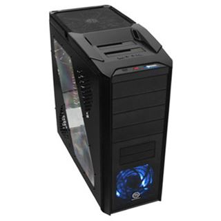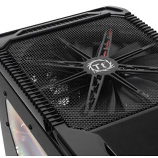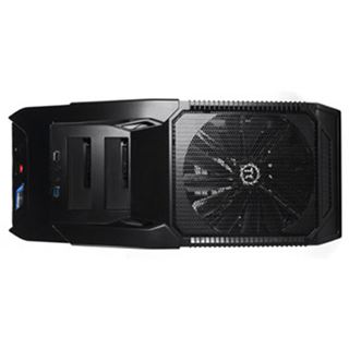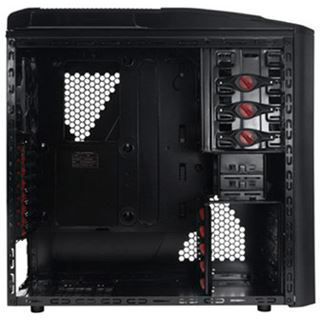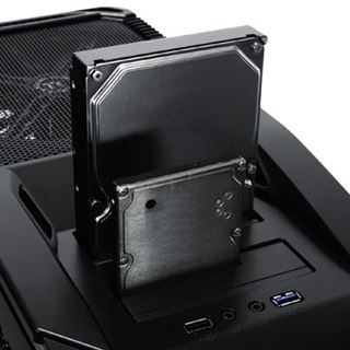 Der komplett schwarz lackierte Innenraum folgt der gewohnten Aufteilung. Im vorderen Bereich erstreckt sich ein gut strukturierter Laufwerksschacht, der drei externe 5,25“ (13,34cm), zwei externe 3,5“ (8,89cm) sowie fünf interne 3,5“ (8,89cm) Slots zur Verfügung stellt. Die Festplatten sind zudem von der Seite einzuschieben, was ebenso den Komfort erhöht. Die Slots können ohne Werkzeug bestückt werden, womit ein schneller und einfacher Einbau sowie ein ebenso schneller Wechsel möglich wird. Damit die später verbaute Hardware auch bei geschlossenem Seitenteil zur Geltung kommt, verfügt das Gehäuse über ein Acryl-Fenster. Im vorderen Bereich des Deckels sind zwei Slots verbaut, in die jeweils ein 3,5“ (8,89cm) oder 2,5“ (6,35cm) SATA-Laufwerk senkrecht gesteckt werden kann. Vor den Hot-Swap Docks befindet sich das I/O-Panel, mit USB 3.0, USB 2.0 und je ein Audio IN/OUT Anschlüssen. Zum Lieferumfang gehören bereits drei Lüfter. Ein 120mm blau leuchtender LED Lüfter befindet sich in der Front, ein 230mm Lüfter im Deckel und ein 120mm Lüfter in der Rückseite.