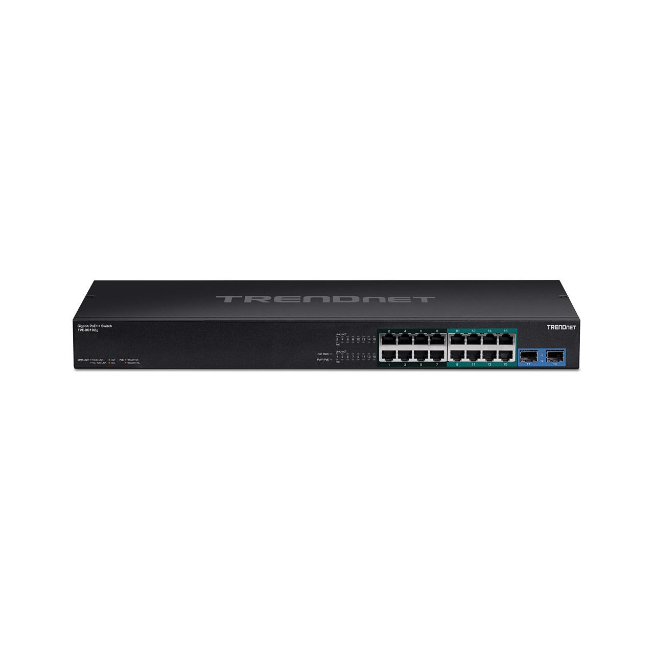 Trendnet TPE-BG182G. Switch-Typ: Unmanaged. Basic Switching RJ-45 Ethernet Ports-Typ: Gigabit Ethernet (10/100/1000), Anzahl der basisschaltenden RJ-45 Ethernet Ports: 8. Vollduplex. MAC-Adressentabelle: 8000 Eintragungen, Routing-/Switching-Kapazität: 36 Gbit/s. Netzstandard: IEEE 802.1p, IEEE 802.3, IEEE 802.3ab, IEEE 802.3af, IEEE 802.3at, IEEE 802.3bt, IEEE 802.3u, IEEE.... Power over Ethernet (PoE). Rack-Einbau, Formfaktor: 1U