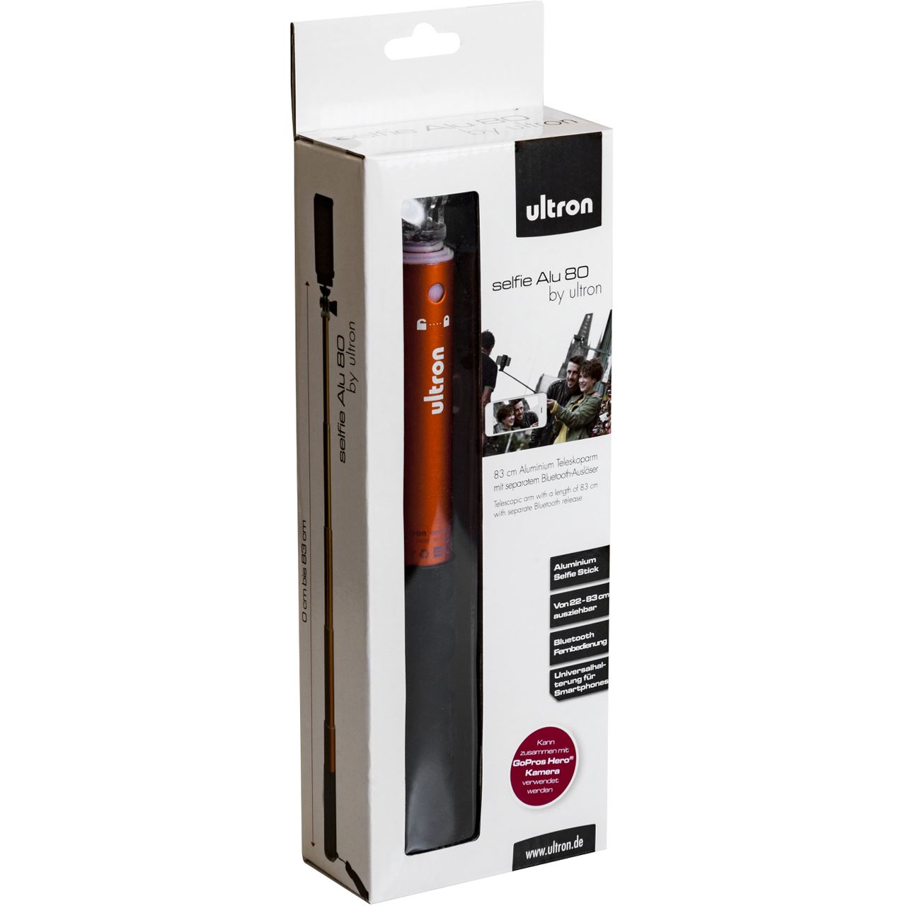 Fernbedienung enthalten, die als Auslöser für die gekoppelte Kamera dient. Verwackelte Bilder gehören so der Vergangenheit an. Hat der Nutzer einmal nicht beide Hände zur Verfügung, kann die Fernbedienung mittels mitgeliefertem Clip am Selfie-Stick befestigt werden und so auch nicht verloren gehen. Der ultron selfie Alu 80 besteht aus Aluminium und lässt sich von 22 - 83 cm ausziehen.