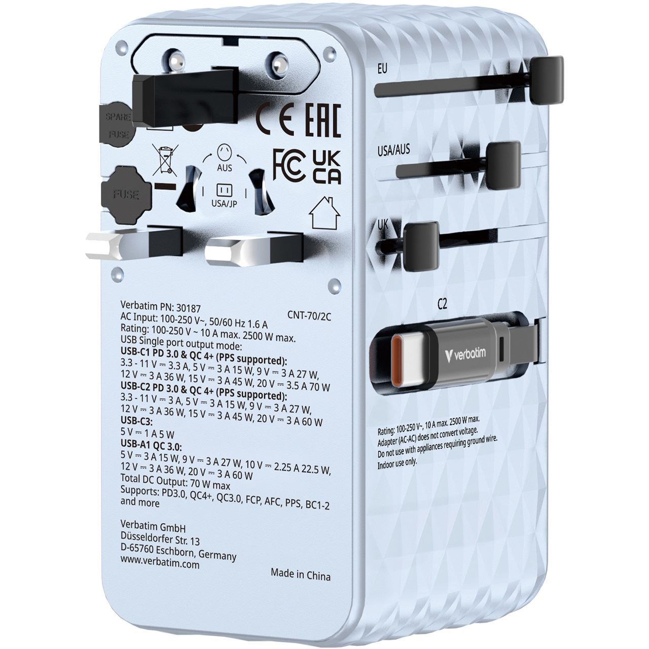 Verbatim 30187. Aufladetyp: Drinnen, Energiequelle: AC, Aufladekompatibilität: Universal. Eingangsspannung: 100 - 250 V, Maximale Ausgangsspannung: 250 V, AC-Adapter Ausgangssstrom: 10 A. Anzahl USB 2.0 Anschlüsse: 1, USB Typ-C Anzahl Anschlüsse: 1, Schnellladung. Produktfarbe: Blau