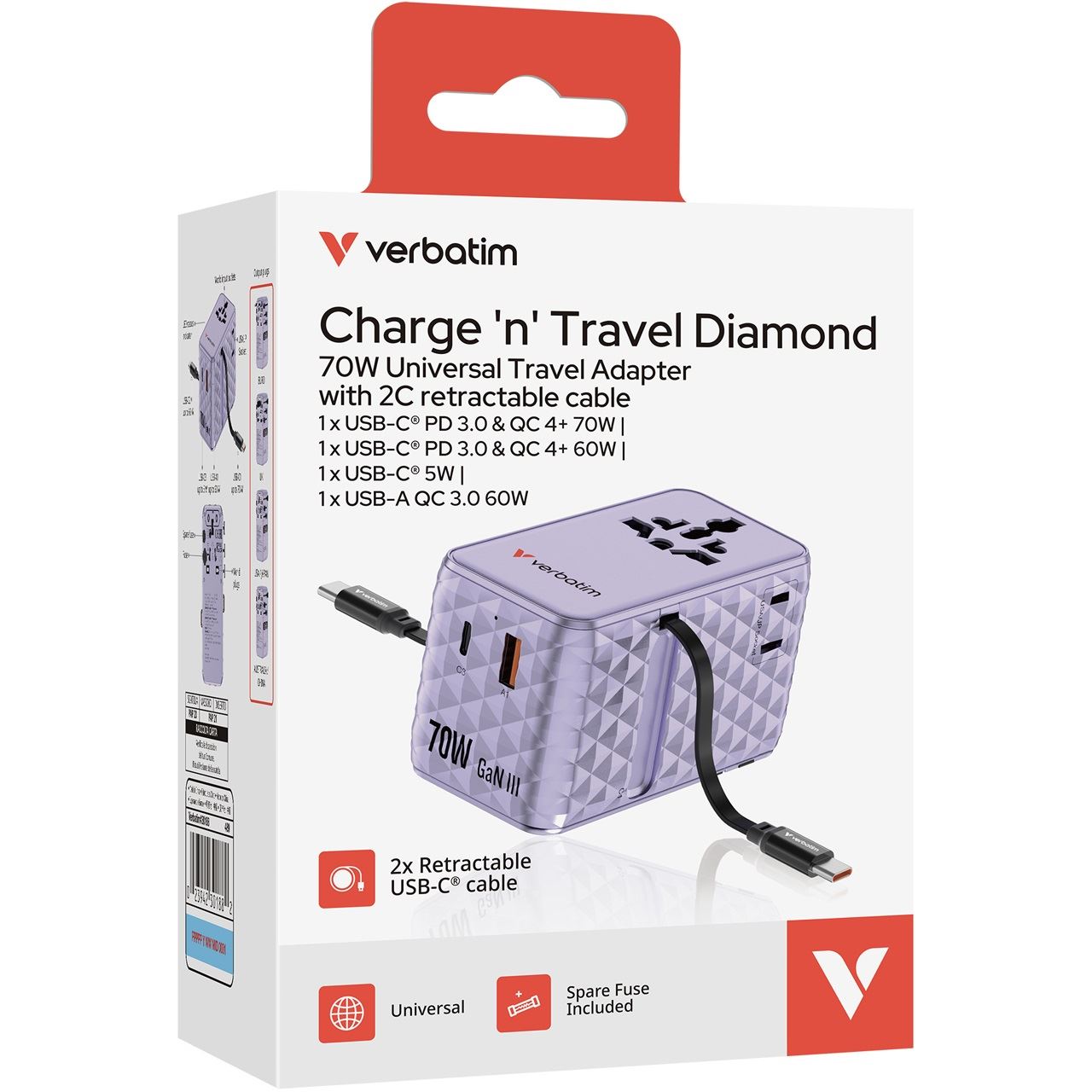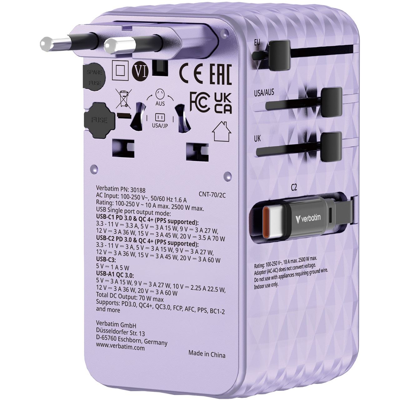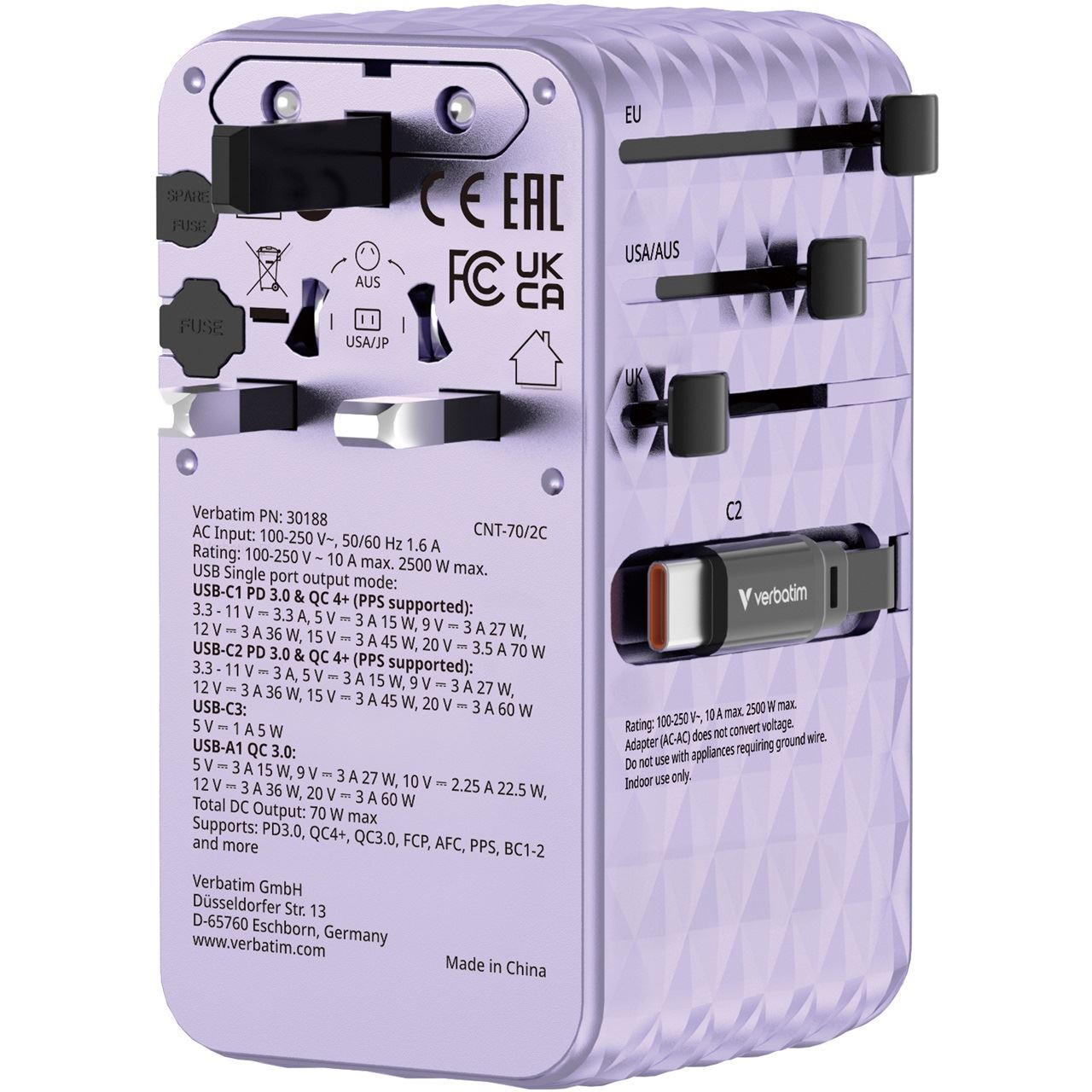 Verbatim 30188. Aufladetyp: Drinnen, Energiequelle: AC, Aufladekompatibilität: Universal. Eingangsspannung: 100 - 250 V, Maximale Ausgangsspannung: 250 V, AC-Adapter Ausgangssstrom: 10 A. Anzahl USB 2.0 Anschlüsse: 1, USB Typ-C Anzahl Anschlüsse: 1, Schnellladung. Produktfarbe: Violett