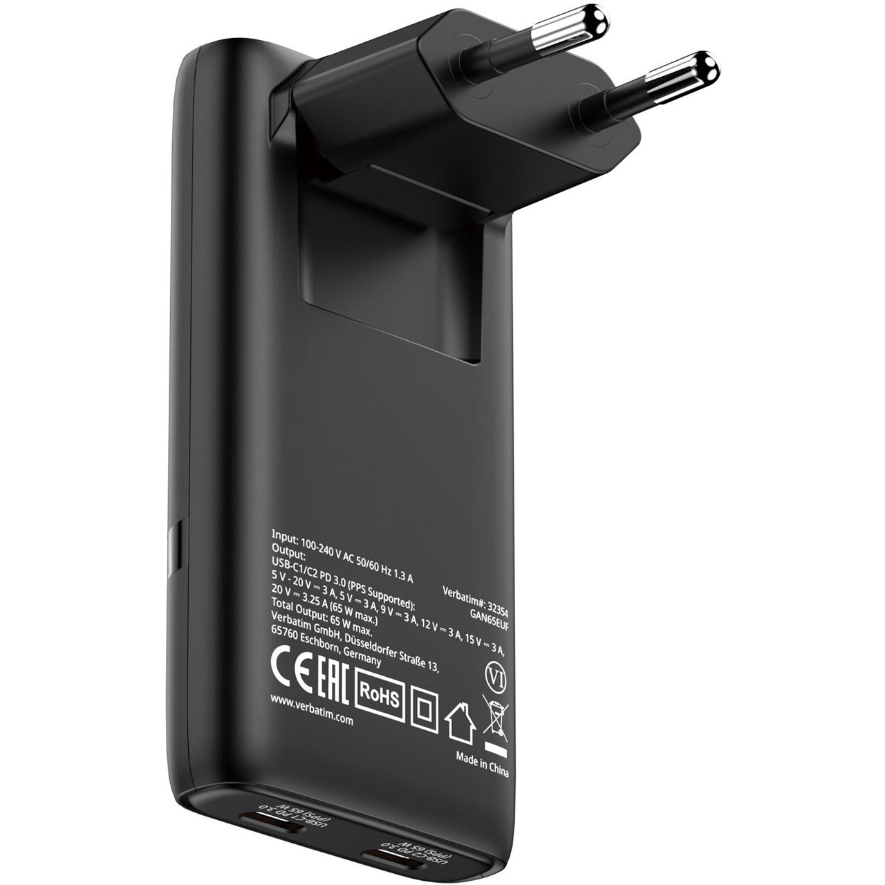 Verbatim 32354. Aufladetyp: Drinnen, Energiequelle: AC, Aufladekompatibilität: Laptop, Smartphone, Tablets. Eingangsspannung: 100 - 240 V, Maximale Ausgangsspannung: 20 V. USB Typ-C Anzahl Anschlüsse: 2, Schnellladung. Produktfarbe: Schwarz