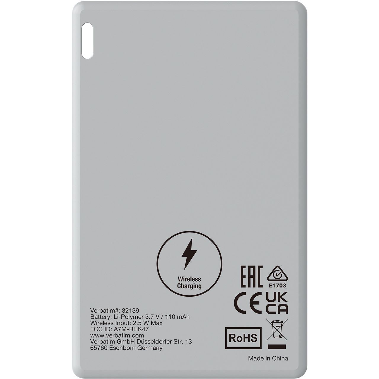Verbatim My Finder. Zweck: Persönlich, Produkttyp: Finder, Produktfarbe: Silber. Akku-/Batteriebetriebsdauer: 1440 h, Akku-/Batteriekapazität: 110 mAh. Unterstützte mobile Betriebssysteme: iOS. Gewicht: 15 g, Breite: 53,8 mm, Tiefe: 85,9 mm. Menge pro Packung: 1 Stück(e)