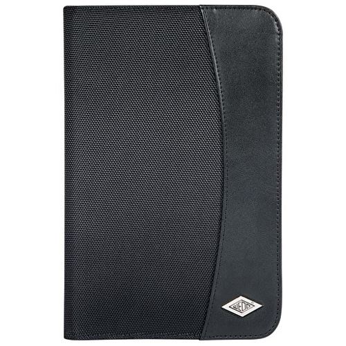 Schreibmappe "Elegance" für DIN A5-Formate. Handlich klein mit praktischer Innenaufteilung: Neben einem Einsteckfach für einen A5-Schreibblock und eine Gummizugschlaufe für ein Schreibgerät ist die Schreibmappe mit zwei Einsteckfächern für A5-Formate, vier Kartenfächern, einem Sichtfenster für Visitenkarten sowie einer großen Gummizugschlaufe für einen Taschenrechner o.ä. ausgestattet. Die außergewöhnliche Kombination von hochwertigem Kunstleder und strukturiertem Nylon gibt dieser Schreibmappe aus der „Elegance"-Taschenserie eine moderne und elegante Optik.