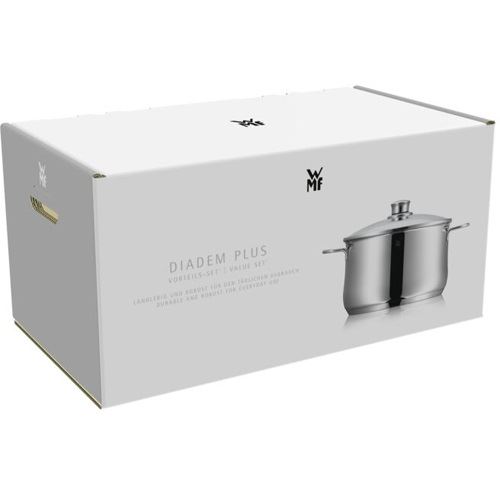 WMF Diadem Plus 0733556040. Typ: Kochset, Produktfarbe: Edelstahl, Material: Edelstahl. Topfdurchmesser: 16 cm, Durchmesser Topf 2: 20 cm, Durchmesser Topf 3: 24 cm. Verpackungsvolumen: 45213 cm³. Anzahl enthaltener Produkte: 9 Stück(e), Anzahl Kochtöpfe: 5 Stück(e). Menge pro ISO Container (20 Fuß): 576 Stück(e), Menge pro ISO Container (40 Fuß): 1232 Stück(e), Produkte pro Palettenlage: 4 Stück(e)