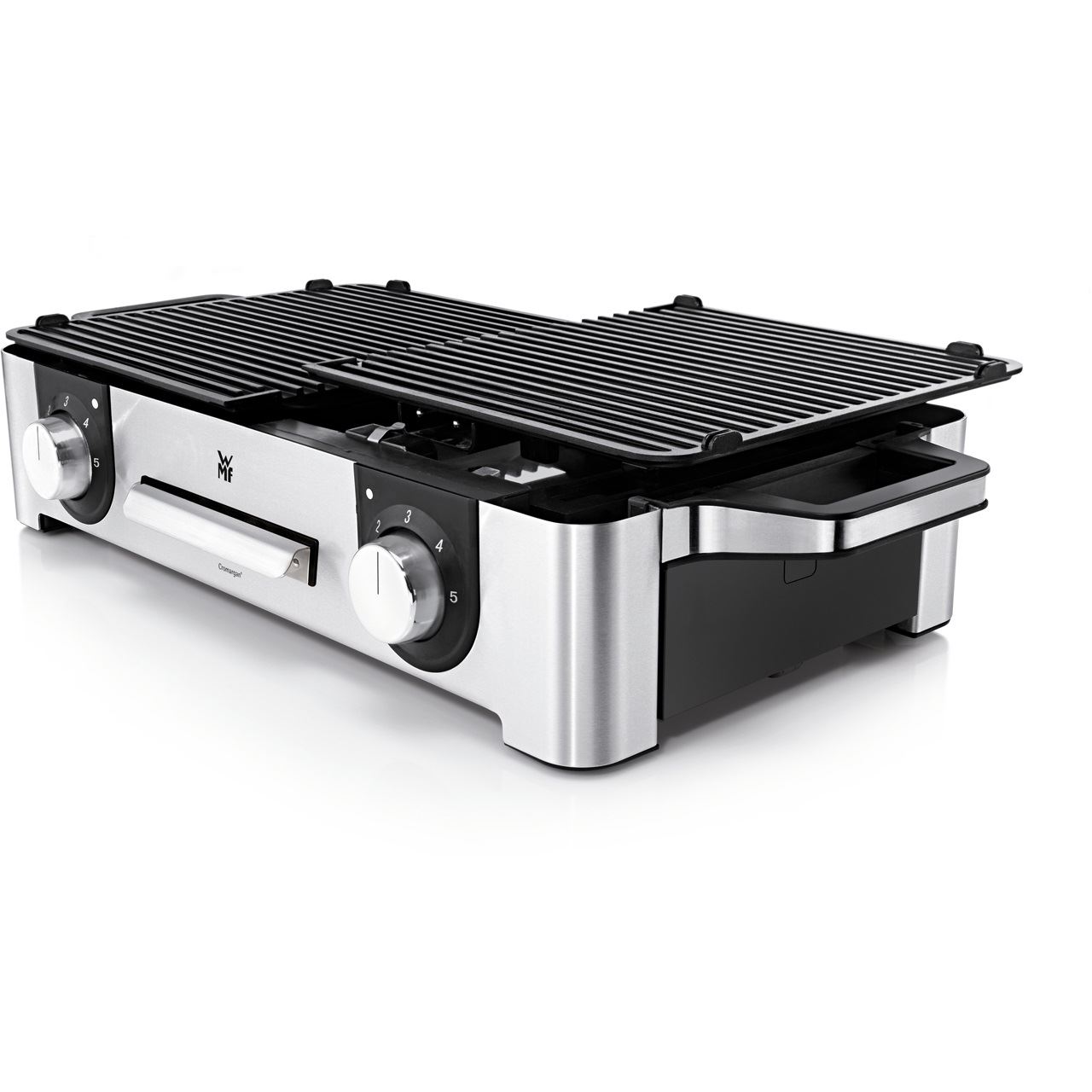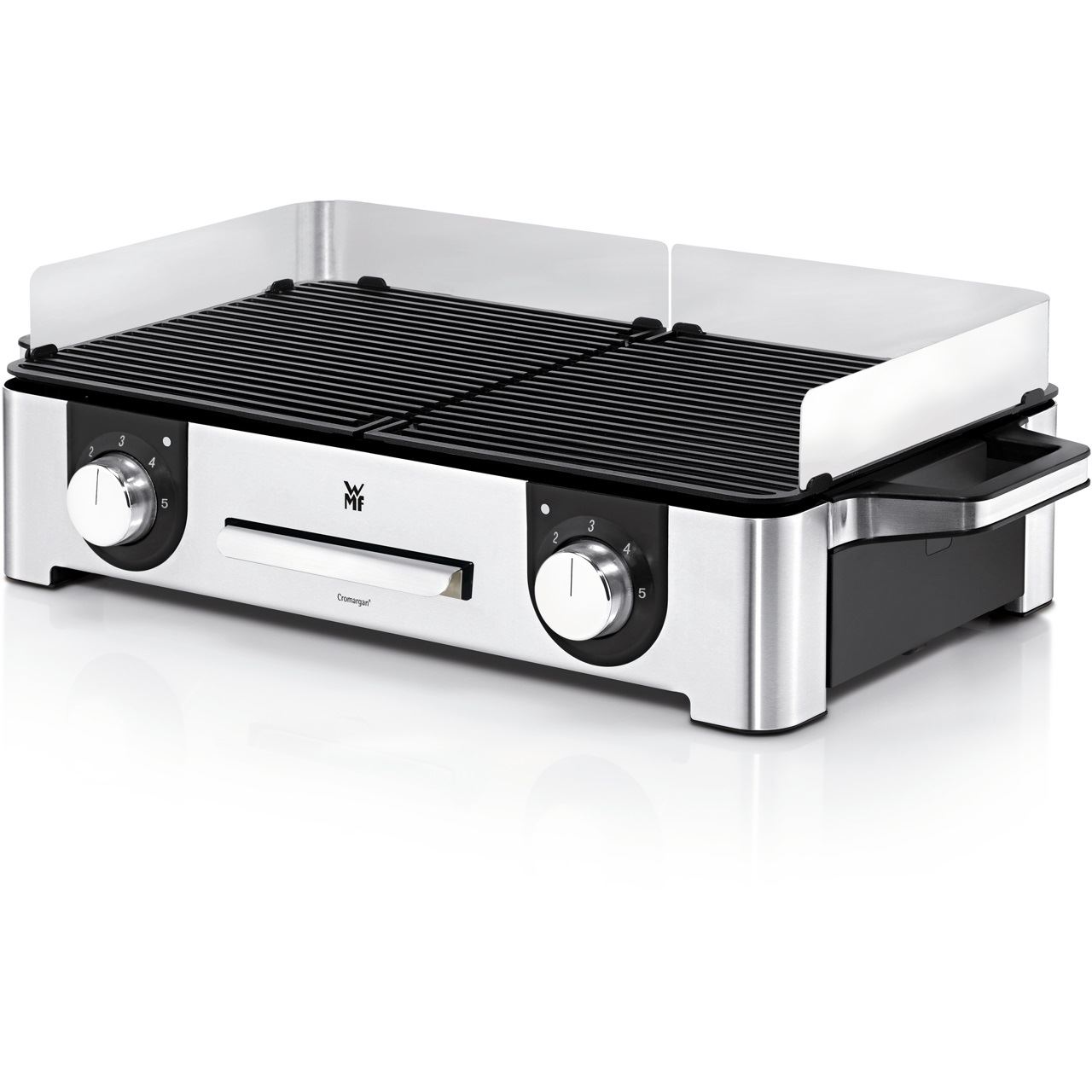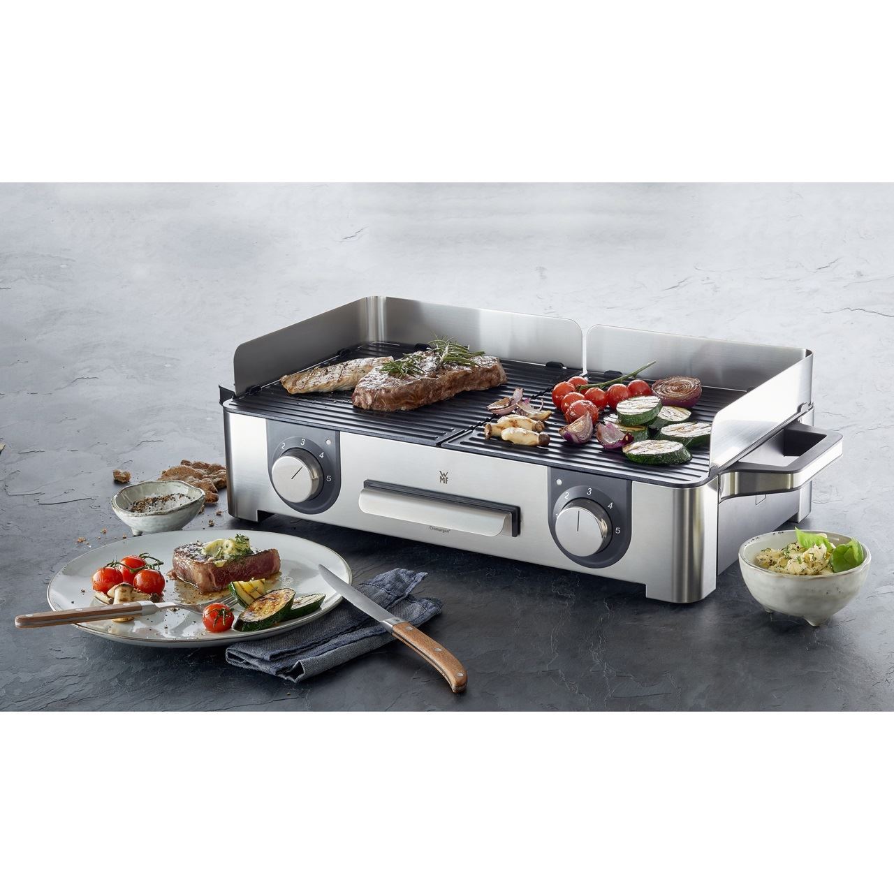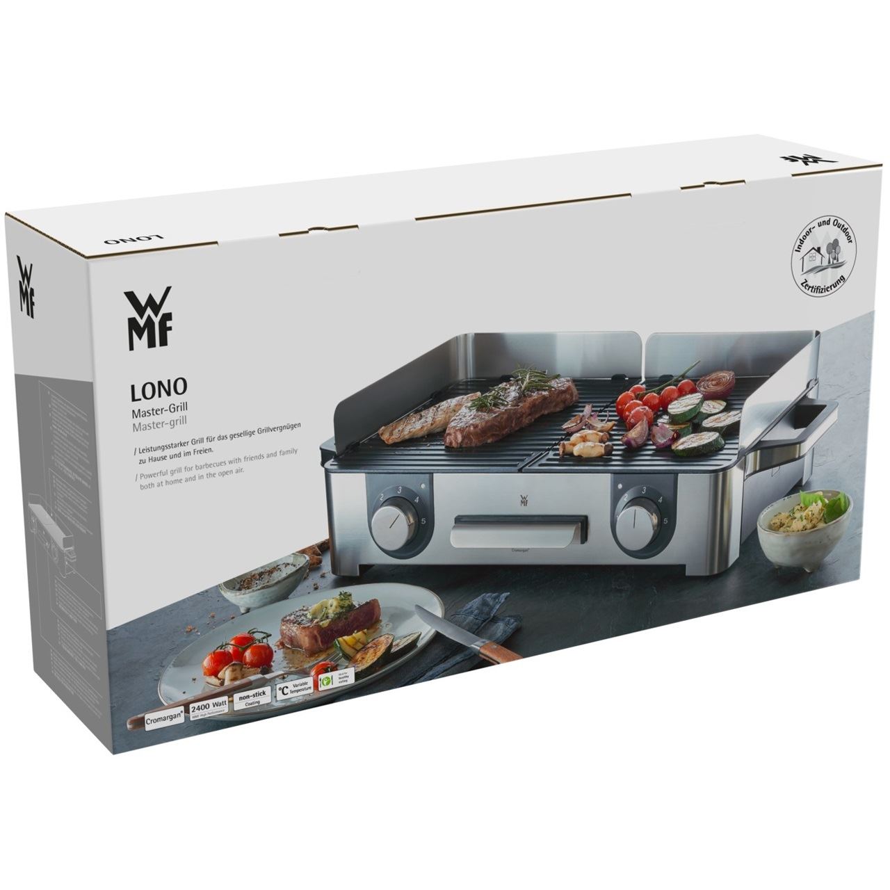 Leistungsstarker Grill für das gesellige Grillvergnügen zu Hause und im Freien. Grillvergnügen für Innen und Außen bietet der WMF LONO Master-Grill aus mattem Cromargan®. Mit einer 28 x 50 cm großen Grillfläche bietet der LONO Master-Grill Platz für die Zubereitung vielseitiger, größerer Grillgerichte. Er hat zwei separate, gerippte Grillplatten, deren Temperatur über getrennte Bedienelemente mit LED-Beleuchtung jeweils stufenlos einstellbar ist. Auch beim LONO Master-Grill wurde das Heizelement in die beiden extra dicken Grillplatten aus Aluminiumguss integriert. Der LONO Master-Grill bietet aber nicht nur viel Platz – seine 2.400 Watt bedeuten perfekte Grillergebnisse. Die herausnehmbare Fettauffangschale und die beiden Grillplatten sind spülmaschinenfest. Für die Verwendung im Freien steht ein abnehmbarer Wind- und Spritzschutz zur Verfügung.