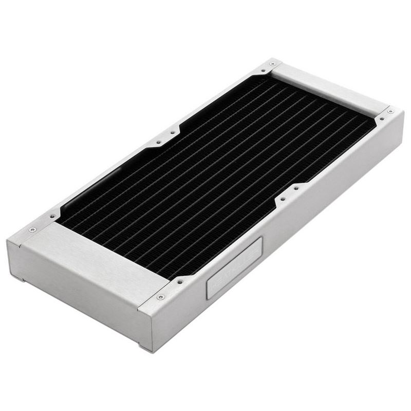 240-mm-Radiator mit 30 mm Dicke, bis zu vier 120er-Lüfter in Push/Pull-Betrieb, Finnen und Kanäle aus Kupfer, exklusives Design durch Gehäuse aus Edelstahl, kompakte Maße und hochwertige Verarbeitung, 2x G1/4-Anschlüsse