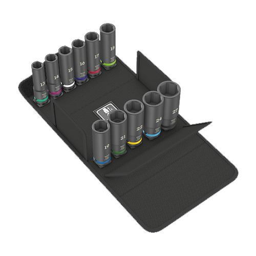 Set mit 11 Impaktor Deep Steckschlüsseln für den Einsatz mit elektrisch oder mit Druckluft angetriebenen Schlagschraubern mit 12,5 mm = 1/2" Antrieb. Lange Ausführung für tiefliegende Verschraubungen und überstehende Gewindestangen. Die Impaktor-Technologie sorgt für überdurchschnittliche Standzeiten auch bei extremen Anforderungen. Das verwendete Sechskantprofil ermöglicht eine hohe Kraftübertragung bei gleichzeitiger Präzision und Schonung des Profils. Mit Take it easy Werkzeugfinder mit Farbkennzeichnung nach Größen - zum einfachen und schnellen Finden des benötigten Werkzeugs.