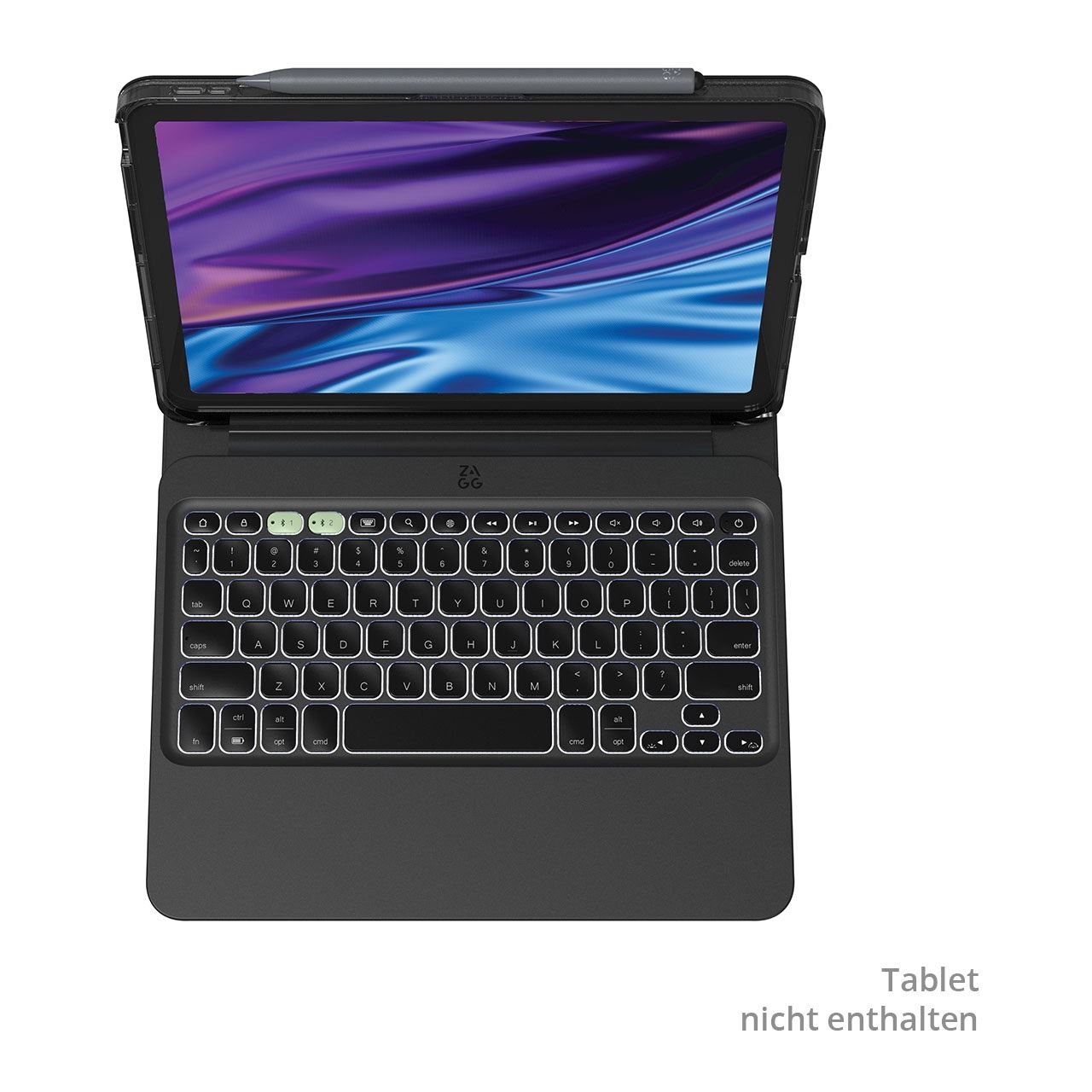 ZAGG Pro Keys 2. Tastatursprache: Schweiz. Markenkompatibilität: Apple, Kompatibilität: iPad Air 11 (M2), Produktfarbe: Schwarz. Übertragungstechnik: Kabellos, Geräteschnittstelle: Bluetooth. Energiequelle: Akku, Akku-/Batterietyp: Integrierte Batterie, Batterielebensdauer: 1 Jahr(e). Verpackungsart: Box