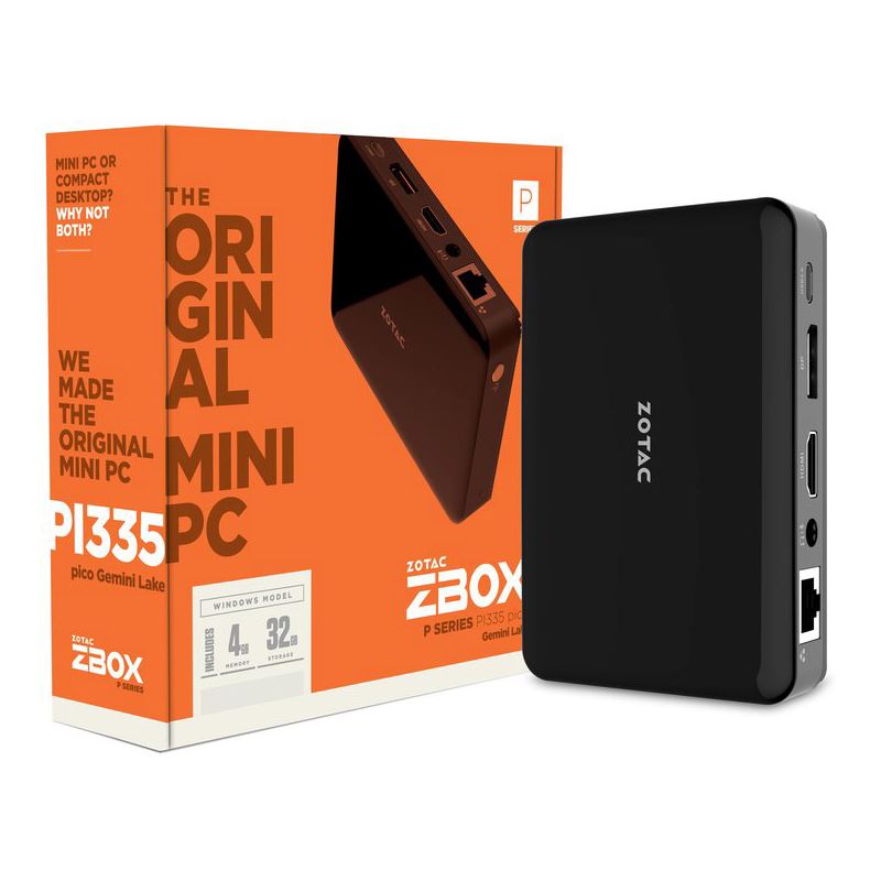 Zotac ZBOX PI335 pico. Prozessor-Taktfrequenz: 1,1 GHz, Prozessorfamilie: Intel® Celeron®, Prozessor: N4100. Speicherkapazität: 4 GB, Interner Speichertyp: LPDDR4-SDRAM. Gesamtspeicherkapazität: 64 GB, Speichermedien: eMMC, Integrierter Kartenleser. Eingebautes Grafikkartenmodell: Intel® UHD Graphics 600. WLAN. Installiertes Betriebssystem: Windows 10 Home, Betriebssystemarchitektur: 64-Bit. Gehäusetyp: UCFF. Produkttyp: Mini-PC. Produktfarbe: Schwarz