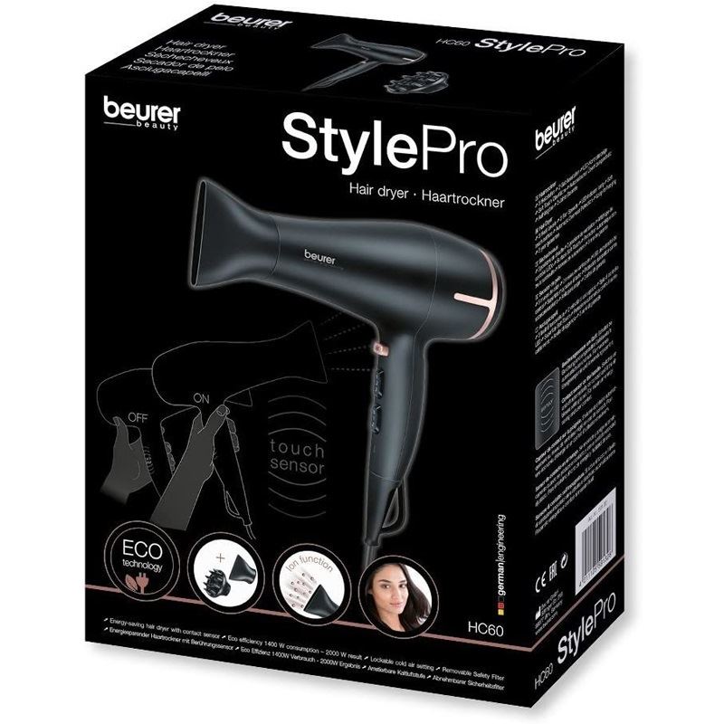 Beurer HC 60. Motortyp: Gleichstrom. Produktfarbe: Schwarz, Oberflächenfärbung: Einfarbig, Hängeart: Hängeschlaufe. Leistung: 1400 W, AC Eingangsspannung: 220-240 V, AC Eingangsfrequenz: 50 - 60 Hz. Gewährleistungsfrist: 3 Jahr(e). Breite: 86 mm, Tiefe: 214 mm, Höhe: 270 mm