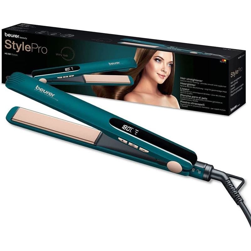 Beurer HS 50. Typ: Glätteisen, Technologie: Warm, Temperatur (min): 120 °C. Produktfarbe: Blau, Plattenmaterial: Keramisches Keratin. Display-Typ: LED, Automatische Abschaltung nach: 30 min. Leistung: 52 W, Energiequelle: AC, Stromverbrauch (Standardbetrieb): 52 W. Breite: 32 mm, Tiefe: 34 mm, Höhe: 293 mm