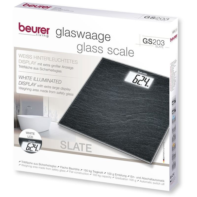 Beurer GS 203 Slate. Typ: Elektronische Personenwaage, Höchstgewichtskapazität: 150 kg, Genauigkeit: 100 g. Display: LCD, Zeichengröße: 4 cm, Anzeigegerät: 83 x 45 mm. Energiequelle: Akku, Akku-/Batterietyp: CR2032, Akku-/Batteriespannung: 3 V. Breite: 300 mm, Tiefe: 300 mm, Höhe: 19 mm. Menge pro Packung: 1 Stück(e), Verpackungsart: Box