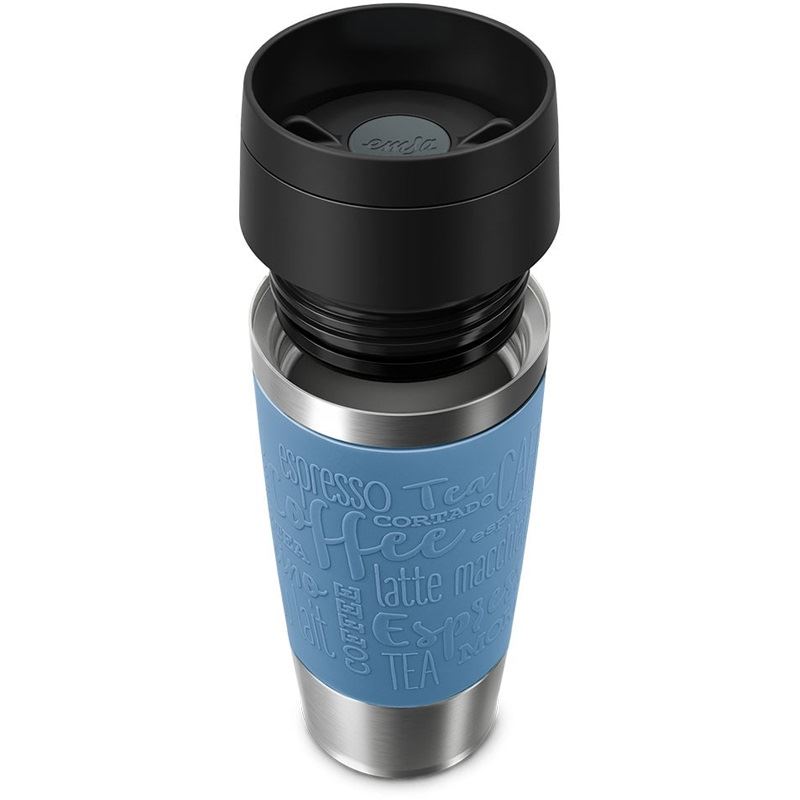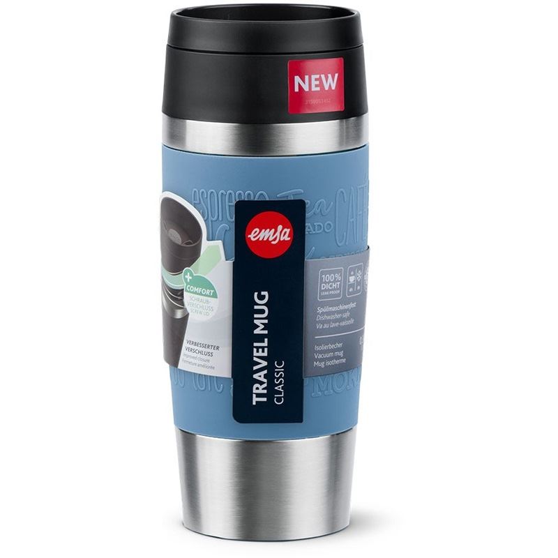 EMSA Travel Mug Classic . Produktfarbe: Blau, Edelstahl, Abdeckungsmaterial: Silikon, Edelstahl, Deckelmaterial: Polypropylen (PP). Volumen (ml): 36 ml, Durchmesser: 8,3 cm, Höhe: 200 mm. Menge pro Packung: 1 Stück(e)