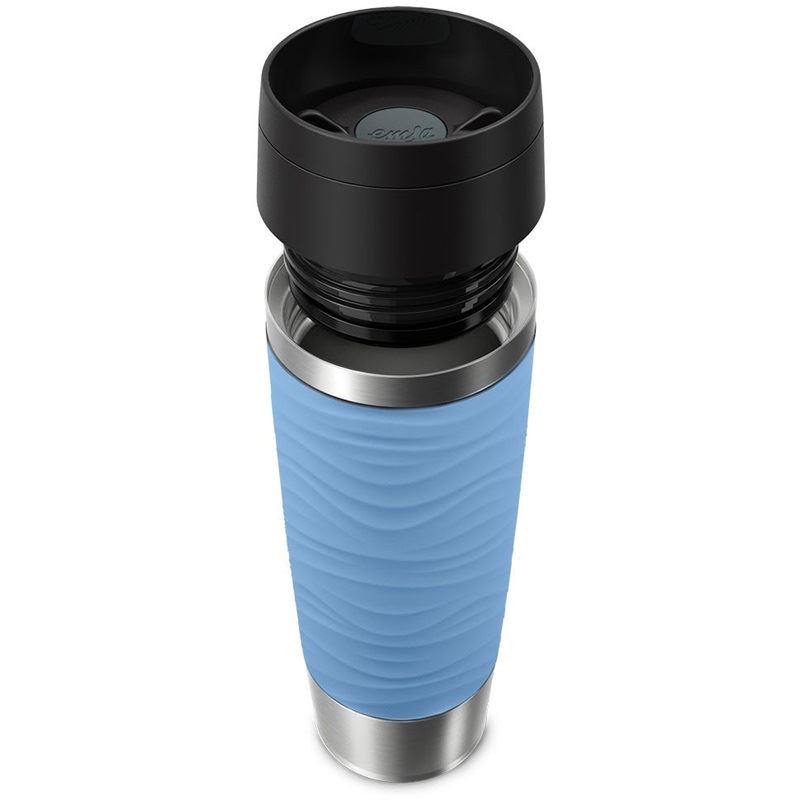 EMSA Travel Mug Waves Grande. Produktfarbe: Blau, Edelstahl, Abdeckungsmaterial: Silikon, Edelstahl, Deckelmaterial: Polypropylen (PP). Volumen (ml): 500 ml, Durchmesser: 8,3 cm, Höhe: 240 mm. Menge pro Packung: 1 Stück(e)
