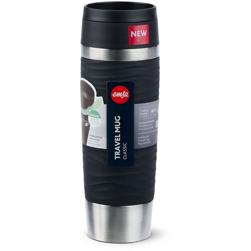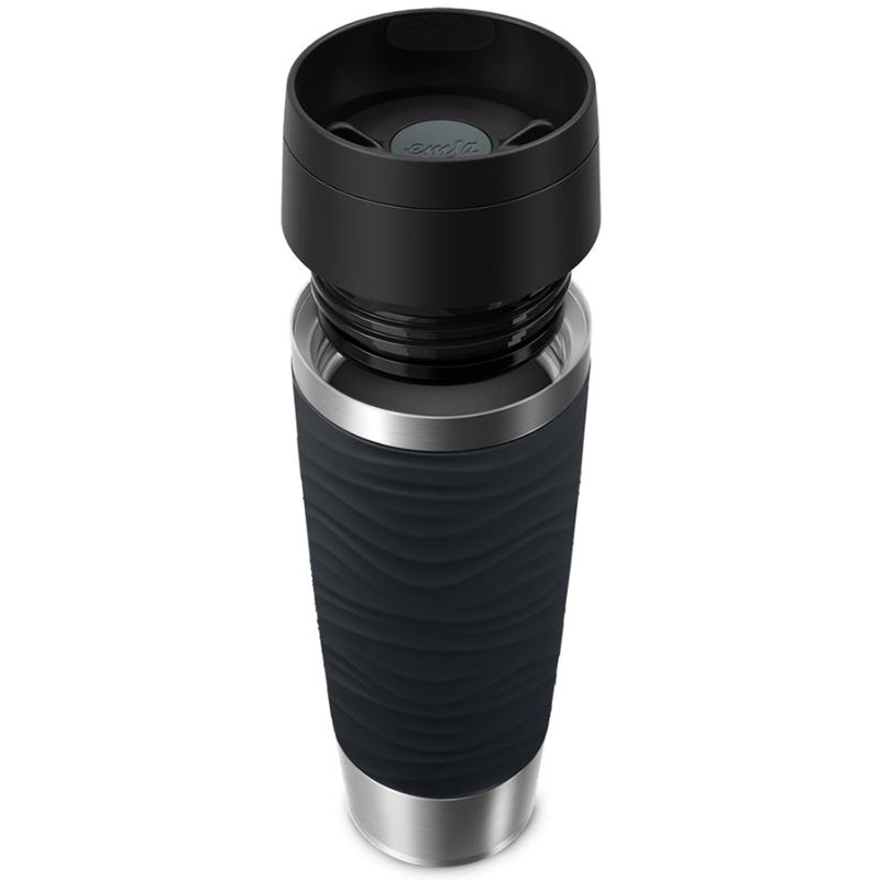 EMSA Travel Mug Waves Grande. Produktfarbe: Schwarz, Edelstahl, Abdeckungsmaterial: Silikon, Edelstahl, Deckelmaterial: Polypropylen (PP). Volumen (ml): 500 ml, Durchmesser: 8,3 cm, Höhe: 240 mm. Menge pro Packung: 1 Stück(e)