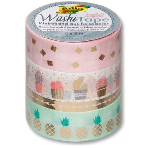 Papierklebeband Washi-Tape, 3 Rollen 15 mm x 5 m und 1 1 Rolle 5 mm x 5 m, farbig sortierte Motive, mit der Hand reißbar, säurefrei Inhalt: 4 Rollen (26418)