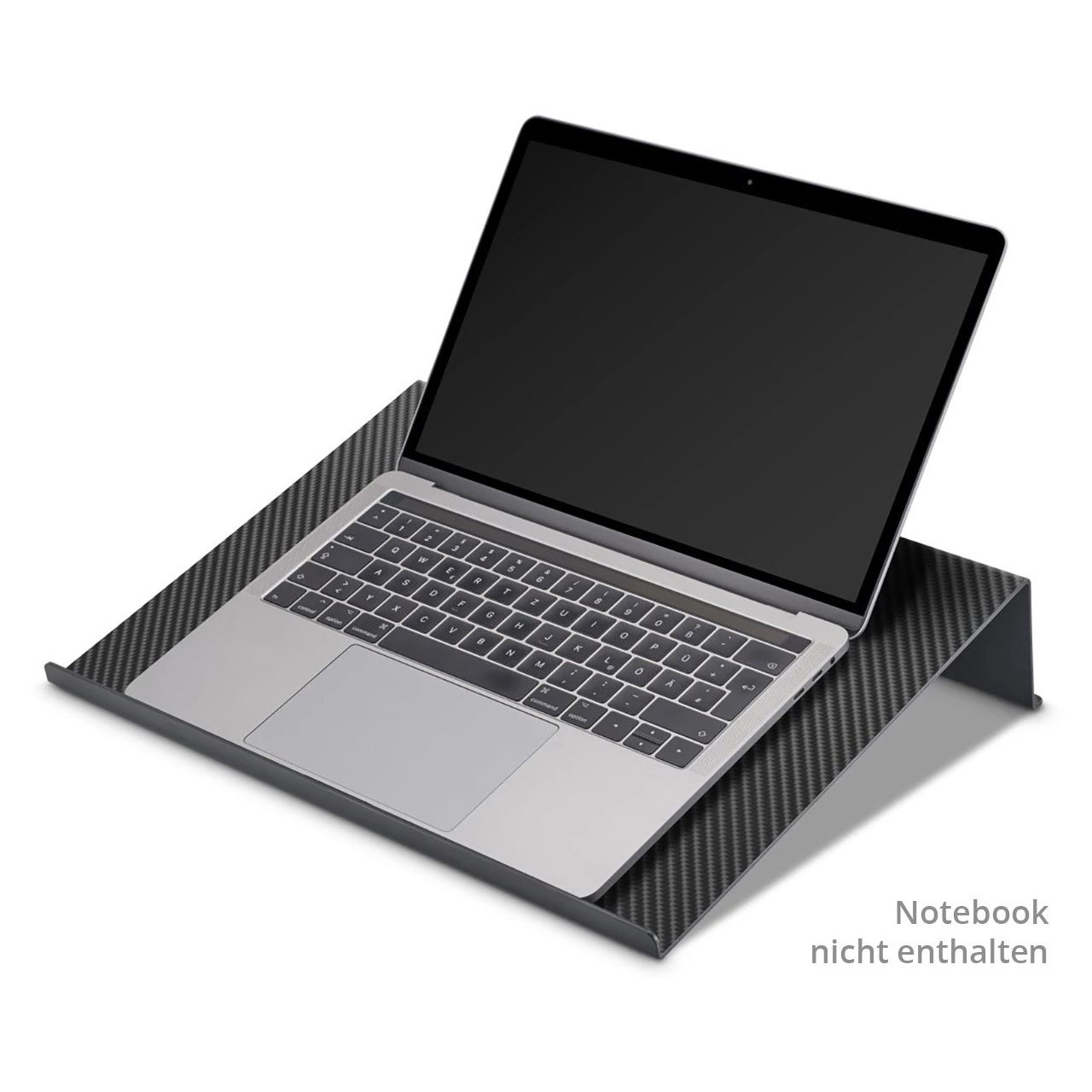 Sieht gut aus: die Laptop-Halterung in ansprechender Carbon-Optik kann sich auf dem Schreibtisch sehen lassen, ob Büro oder Home-Office