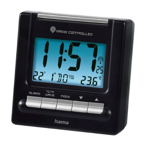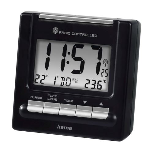 Hama RC200. Typ: Digitaler Wecker, Produktfarbe: Schwarz. Farbe der Hintergrundbeleuchtung: Blau. Akku-/Batterietyp: AAA Micro. Breite: 80 mm, Höhe: 77 mm, Tiefe: 45 mm. Menge pro Packung: 1 Stück(e)