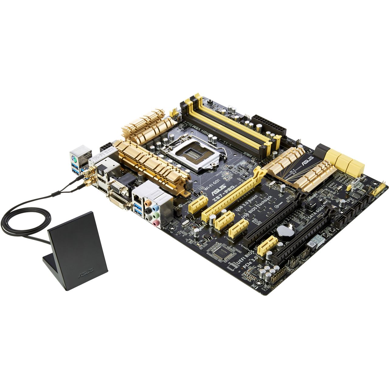 Beim ASUS Z87-Pro handelt es sich um ein üppig ausgestattetes Z87-Mainboard, das besonders für schnelle Quadcore-Prozessoren der Core-i7- oder Core-i5-Reihe die ideale Basis darstellt. Das schwarze Board mit vielen goldenen Akzenten kommt mit vier DIMM-Slots für DDR3-Arbeitsspeicher im schnellen Dual-Channel-Mode. Der Onboard-Soundchip kann sowohl über die sechs analogen Klinkenbuchsen als auch über den optischen Toslink-Digitalanschluss genutzt werden.