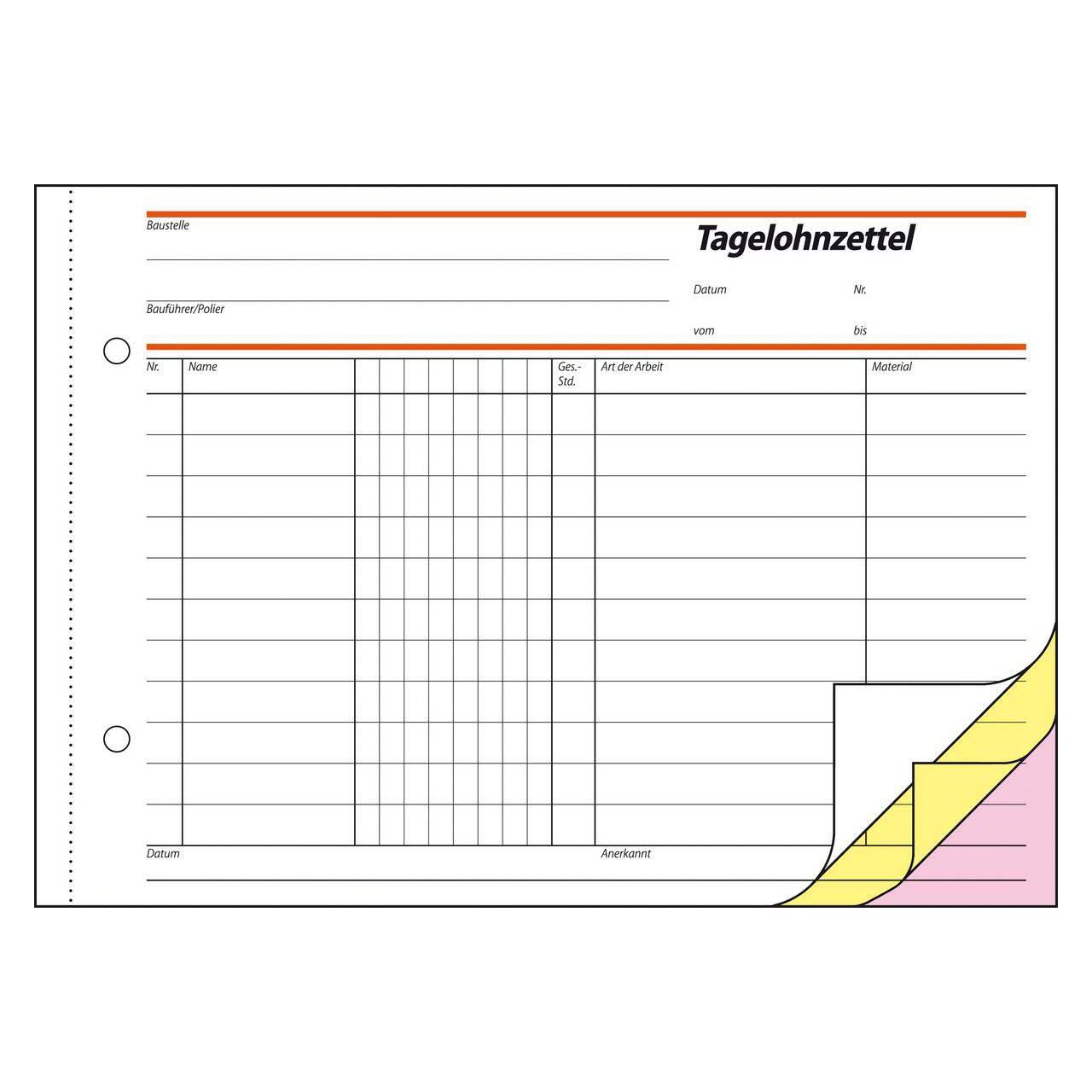 Selbstdurchschreibender Tagelohnzettel im Format DIN A5 quer mit 40 Originalen + 40 x 2 Kopien, inklusive integrierter Schreibunterlage. FSC® zertifiziert, aktuell und rechtssicher. Die erste Kopie ist gelb, die Zweite rosa. Alle Blätter mit Abheftlochung und ultrafeiner Microperforation für ein schnelles und sauberes Herauaustrennen. Zur Verwendung speziell auf dem Bau und im Handwerk - zur exakten Auflistung der Tagesleistung (Arbeitsstunden, Arbeitsleistung und Material). Eine Sicherheitsbindung macht das Formularbuch besonders stabil und haltbar.