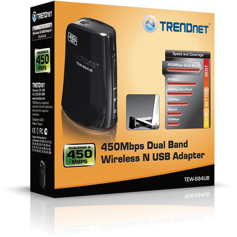 Der TEW-684UB, TRENDnets kompakter 450MBit/s Dualband W-LAN N USB Adapter, verbindet ein Laptop oder einen Desktop-PC mit einem ultraschnellen 450 MBit/s Dualband W-LAN Netzwerk. Schnelle Anbindung an ein 450 MBit/s 2,4 oder 5 Ghz W-LAN Netzwerk mit Knop