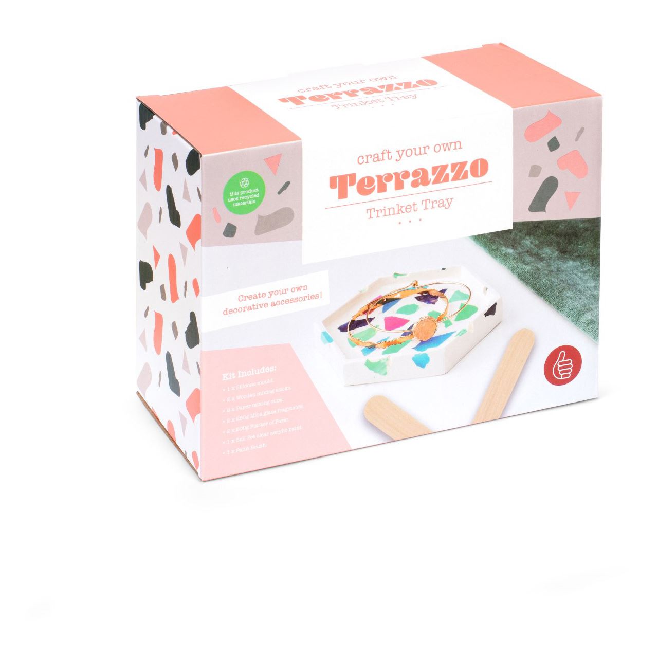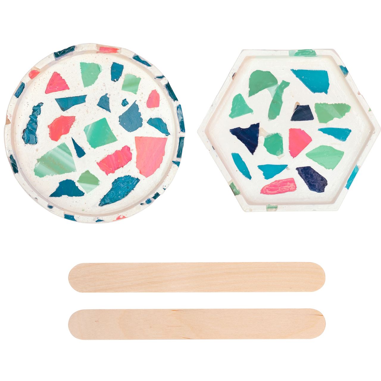 Die Kunst des Terrazzo hat sich von den schicken Cafés in den italienischen Städten zu einem der angesagtesten Einrichtungstrends entwickelt. Mit unseren Sets kannst du dein eigenes Terrazzo Schmucktablett aus recycelten Materialien ganz einfach zu Hause herstellen. Durch die einzigartige Zusammensetzung der farbenfrohen Materialien wird das fertige Ergebnis zum Unikat.